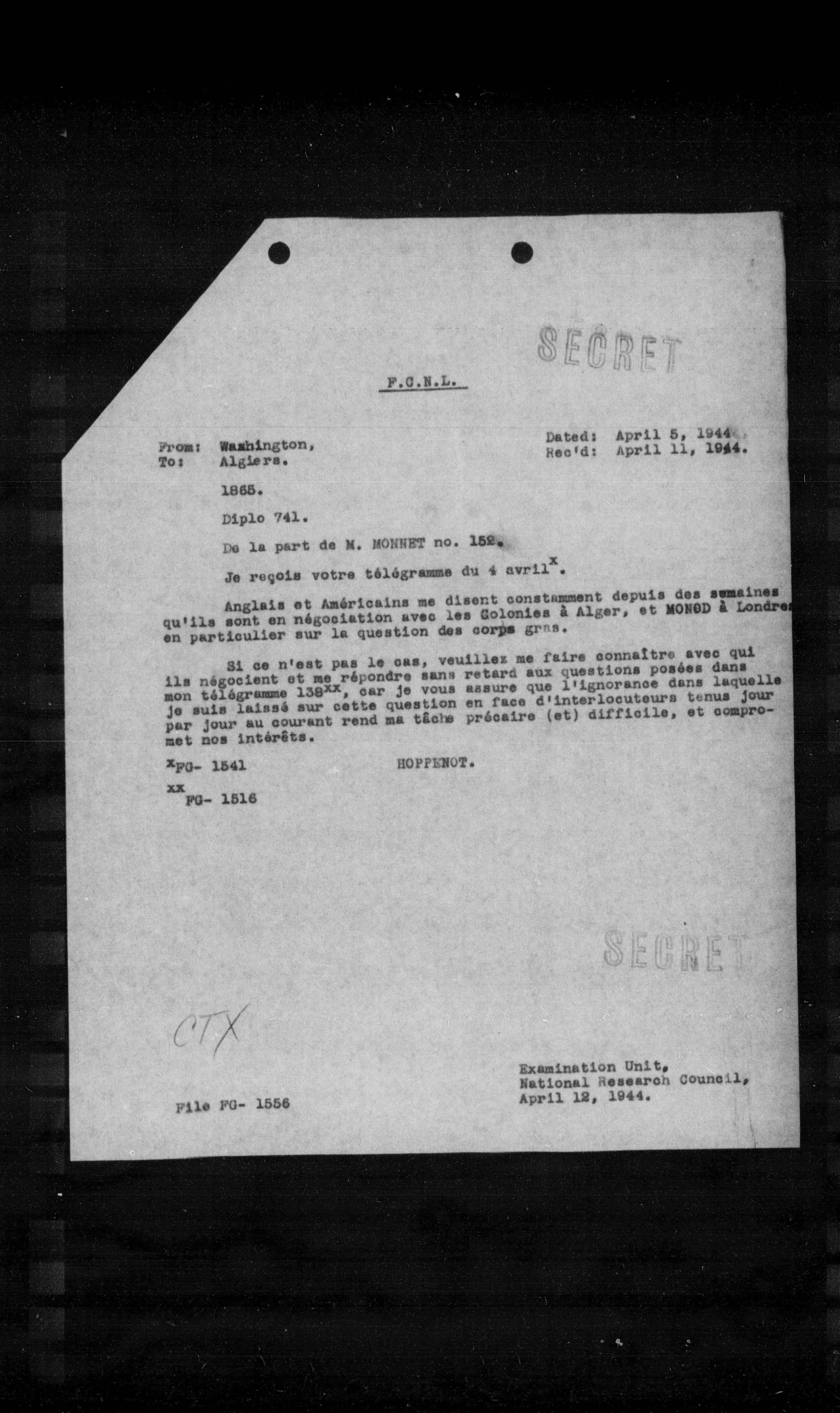 Anglais et Américains me disent constammant depuis des semaines qu'ils sont en négociation avec les Golonies à Alger, et MONGD à Londre en particulier sur la question des corps gras.