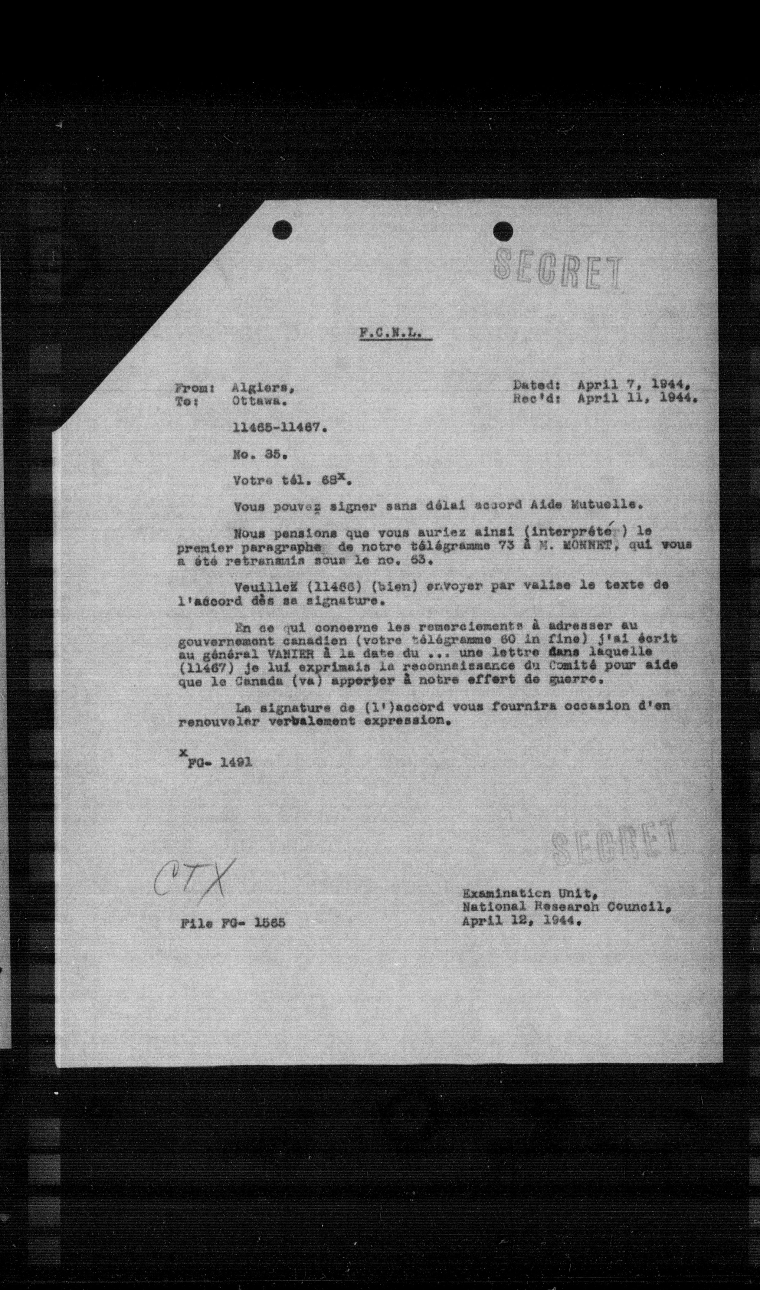 En ce qui concerne les remerciements à adresser au gouvernement canadien (votre tálágramme 60 in fine) j'ai écrit au général VANIER à la date du ... une lettre dans laquelle (11467) je lui exprimais la reconnaissance du comité pour aide que le Canada (va) apporter à notre affert de guerre.