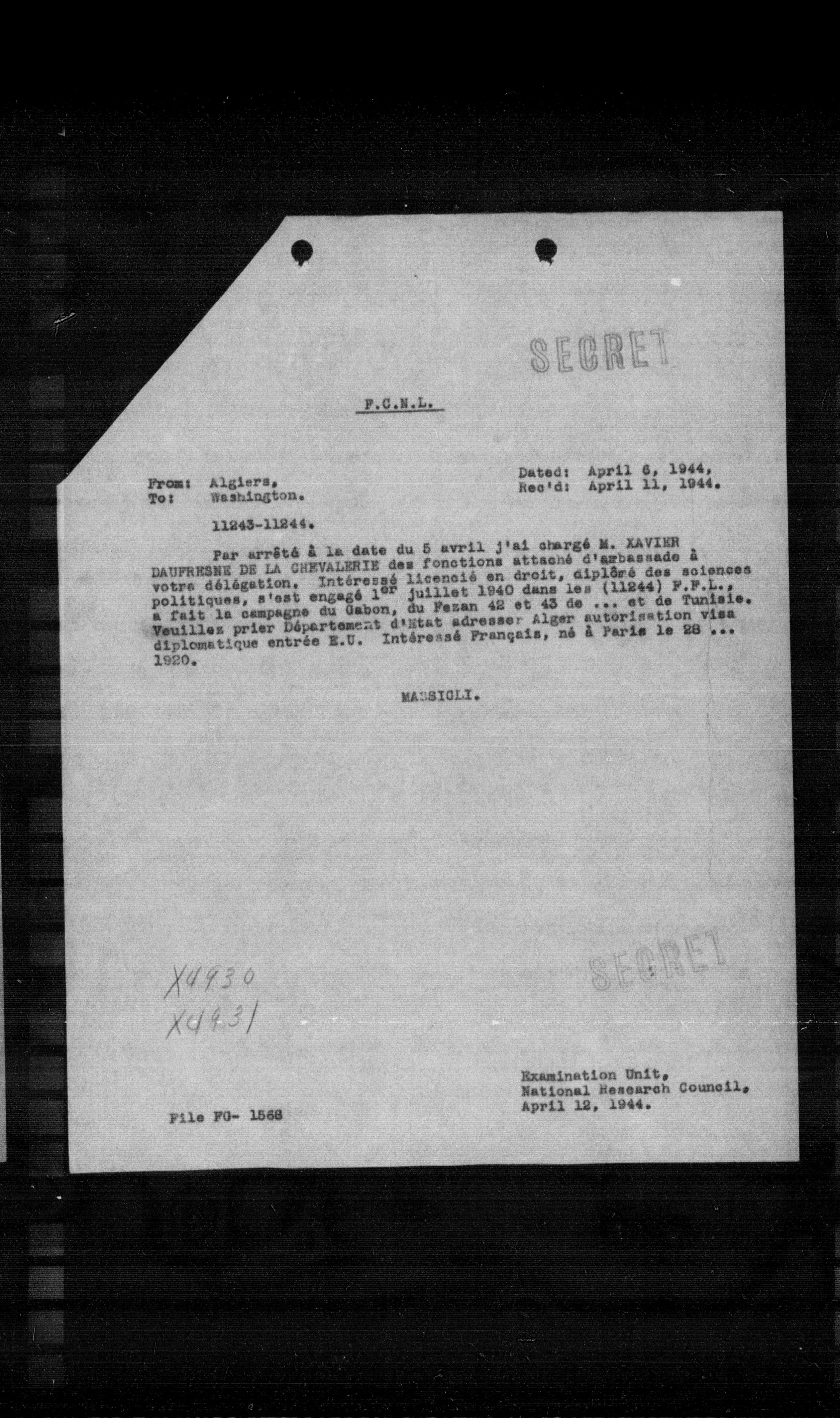 DAUFRISHE DE LA CHRVALERIE des fonctions attaané d'arbassade a votre délégation. Intéressé licencié en droit, diplôré des sciences politiques, s'est engagé 1er juillet 1940 dans les (11244) F.F.L., a fait la campagne du Gabon, du Fexan 42 et 43 de ... et de Tunisie. Veuillez prier Département et Etat adresse: Alger autorisation visa diplomatique entrée E.C. Intéressé Français, né a Paris le 28 ... 1920.