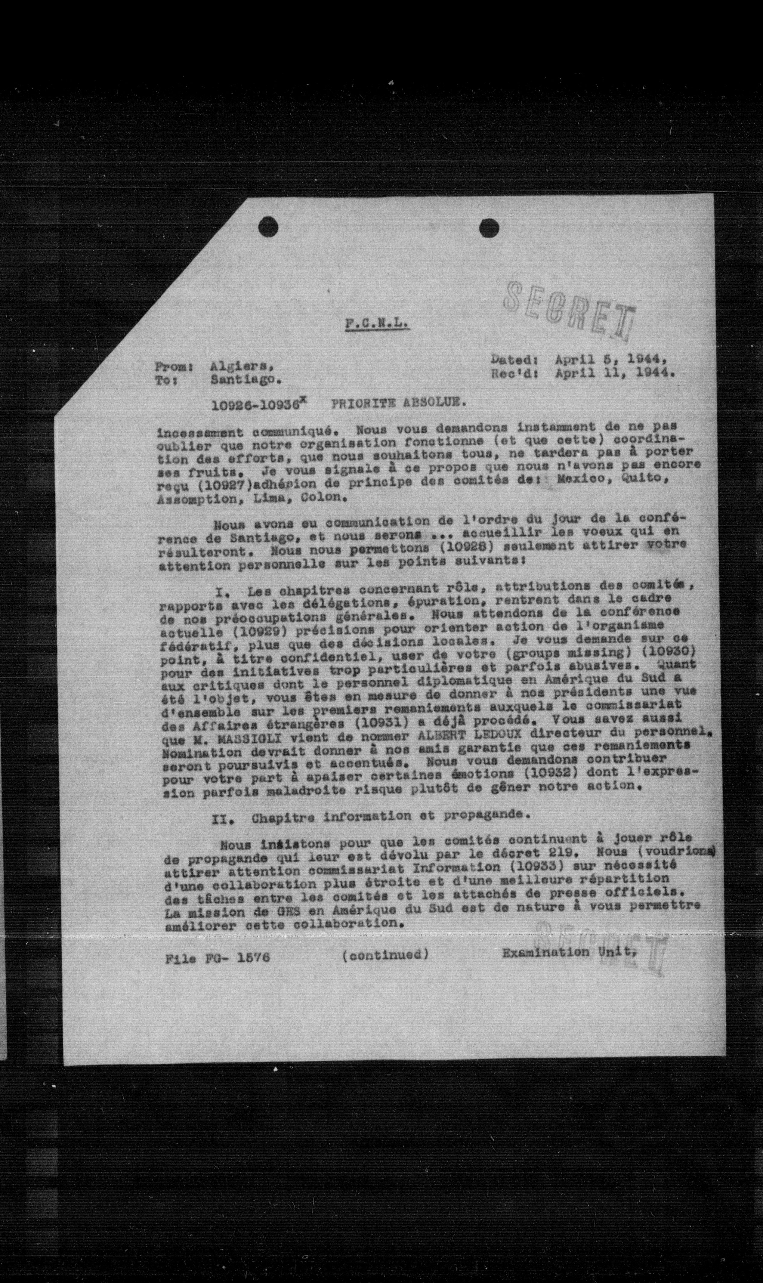 I. Les chapitres concernant rôle, attributions des comités, rapports avec les délégations, épuration, rentrant dans le cadre de nos préoccupations générales. Nous attendons de la conférence actuelle (10929) précisions pour orienter action de l'organisme fédératif, plus que des décisions locales. Je vous demande sur ce point, à titre confidentiel, user de votre (groups missing) (10930) pour des initiatives trop particulières et parfois abusives. Quant aux critiques dont le personnel diplomatique en Amérique du Sud a été l'objet, vous êtes en mesure de donner à nos présidents une vue d'ensemble sur les premiers remaniements auxquels le commissariat des Affaires étrangères (10931) a déjà procédé. Vous savez aussi que M. MASSEGLI vient de nommer ALBERT LEDOUX directeur du personnel. Nomination devrait donner à nos amis garantie que ces remaniements seront poursuivis et accentués. Nous vous demandons contribuer pour votre part à apaiser certaines émotions (10932) dont l'expression parfois maladroite risque plutôt de gêner notre action.
