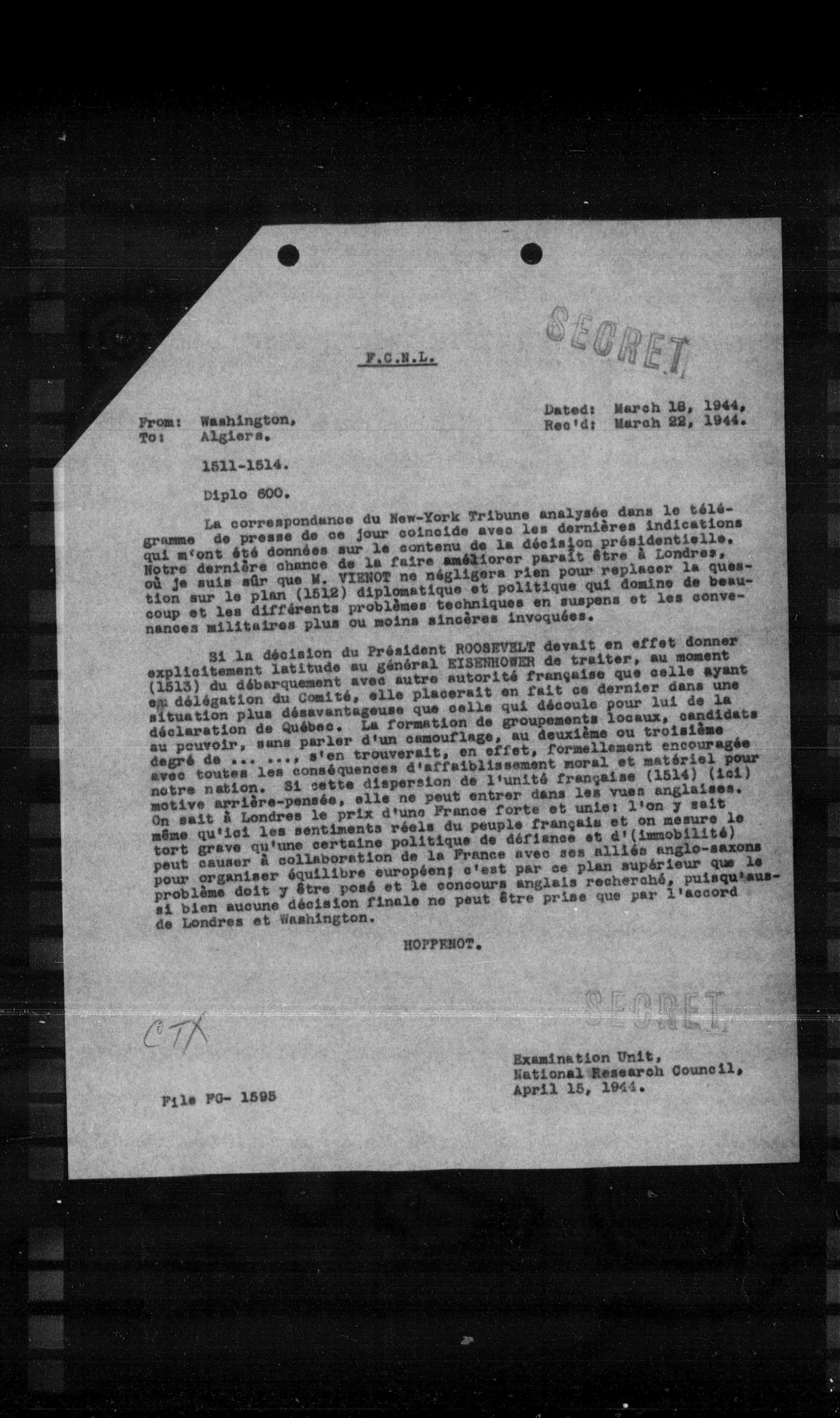 **Examination Unit, National Research Council, April 15, 1944.**