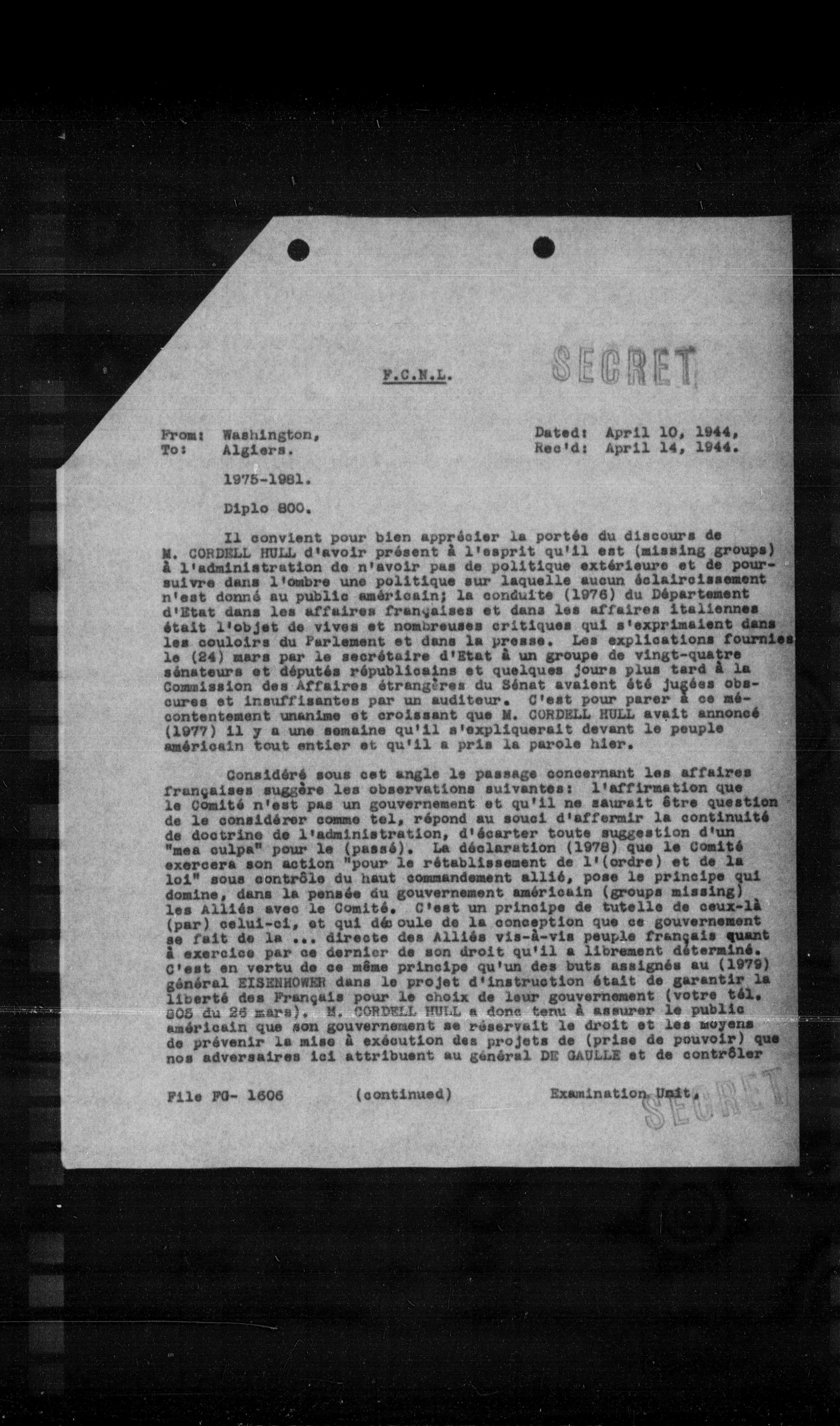 Considéré sous cet angle le passage concernant les affaires françaises suggère les observations suivantes: l'affirmation que le Comité n'est pas un gouvernement et qu'il ne saurait être question de le considérer comme tel, répond au souci d'affermir la continuité de doctrine de l'administration, d'écarter toute suggestion d'un "mea culpa" pour le (passé). La déclaration (1978) que le Comité exercera son action "pour le rétablissement de l'(ordre) et de la loi" sous contrôle du haut commandement allié, pose le principe qui domine, dans la pensée du gouvernement américain (groups missing), les alliés avec le Comité. C'est un principe de tutelle de ceux-là (par) celui-ci, et qui découle de la conception que ce gouvernement se fait de la ... directe des Alliés vis-à-vis peuple français quant à exercice par ce dernier de son droit qu'il a librement déterminé. C'est en vertu de ce même principe qu'un des buts assignés au (1979) général EISENHOWER dans le projet d'instruction était de garantir la liberté des Français pour le choix de leur gouvernement (votre tel. SOS du 26 mars). M. CORDELL HULL a donc tenu à assurer le public américain que son gouvernement se réservait le droit et les moyens de prévenir la mise à exécution des projets de (prise de pouvoir) que nos adversaires ici attribuent au général DE GAULLE et de contrôler