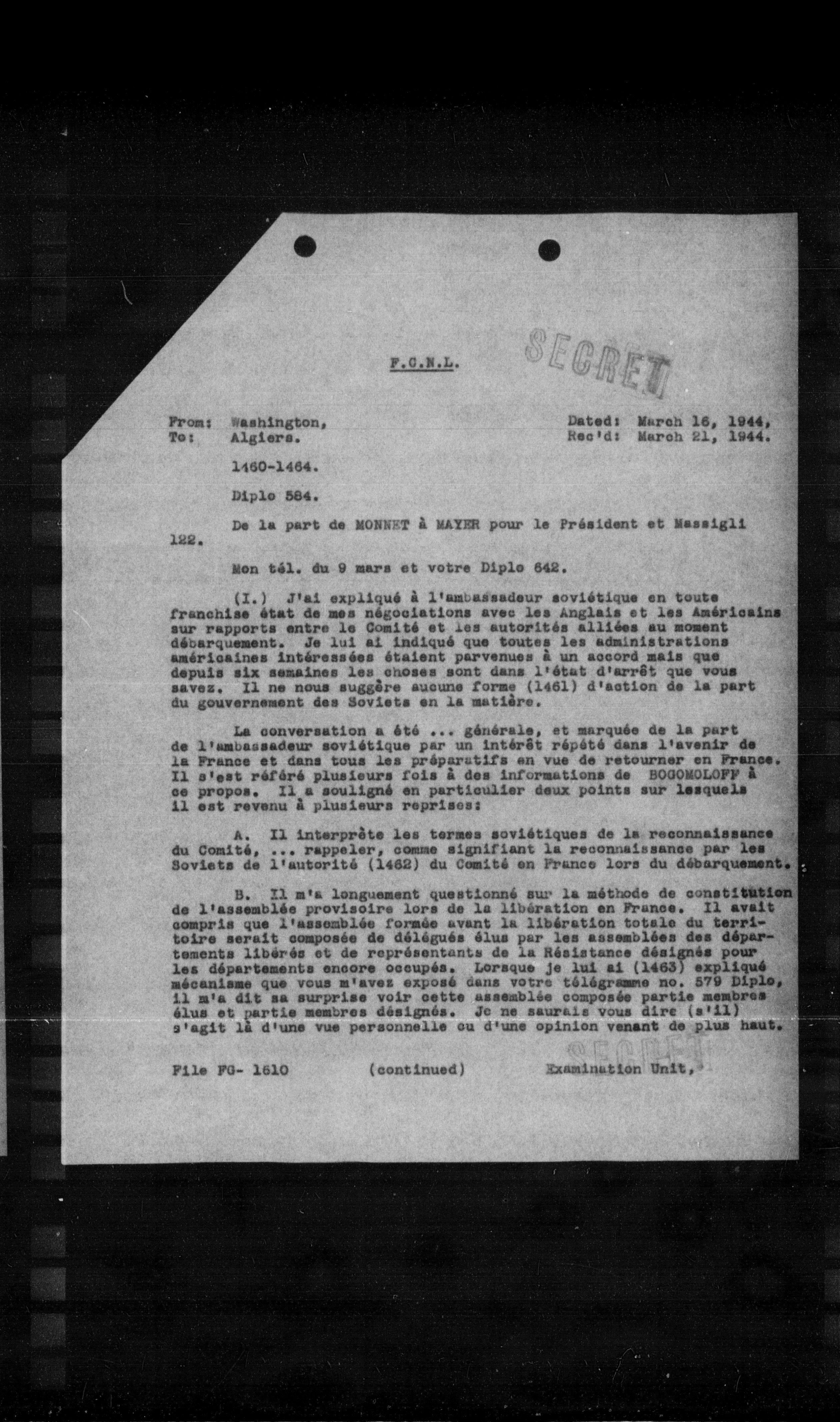 (1.) J'ai expliqué à l'ambassadeur soviétique en toute franchise état de mes négociations avec les Anglais et les Américains sur rapports entre le Comité et les autorités alliées au moment débarquement. Je lui ai indiqué que toutes les administrations américaines intéressées étaient parvenues à un accord mais que depuis six semaines les choses sont dans l'état d'arrêt que vous savez. Il ne nous suggère aucune forme (1461) d'action de la part du gouvernement des Soviets en la matière.
