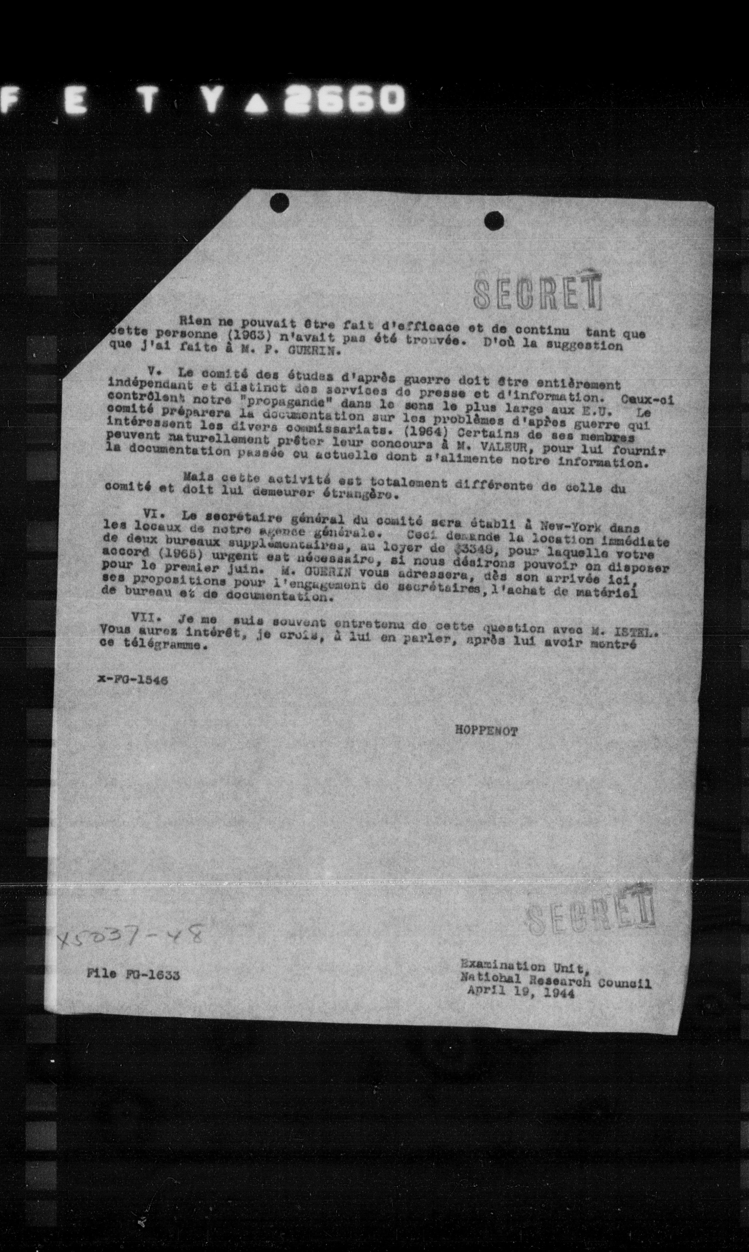 V. Le comité des études d'après guerre doit otre entièrement indépendant et distinct des services de presse et d'information. Ceux-ci contrôlent notre "propagande" dans le sens le plus largo aux E.U. Le comité préparera la documentation sur les problèmes d'apres guerre qui intéressent les divers commissariats. (1964) Certains de ses membres peuvent naturellement proter leur concours a M. VALEUR, pour lui fournir la documentation passée ou actuelle dont s'alimente notre information.