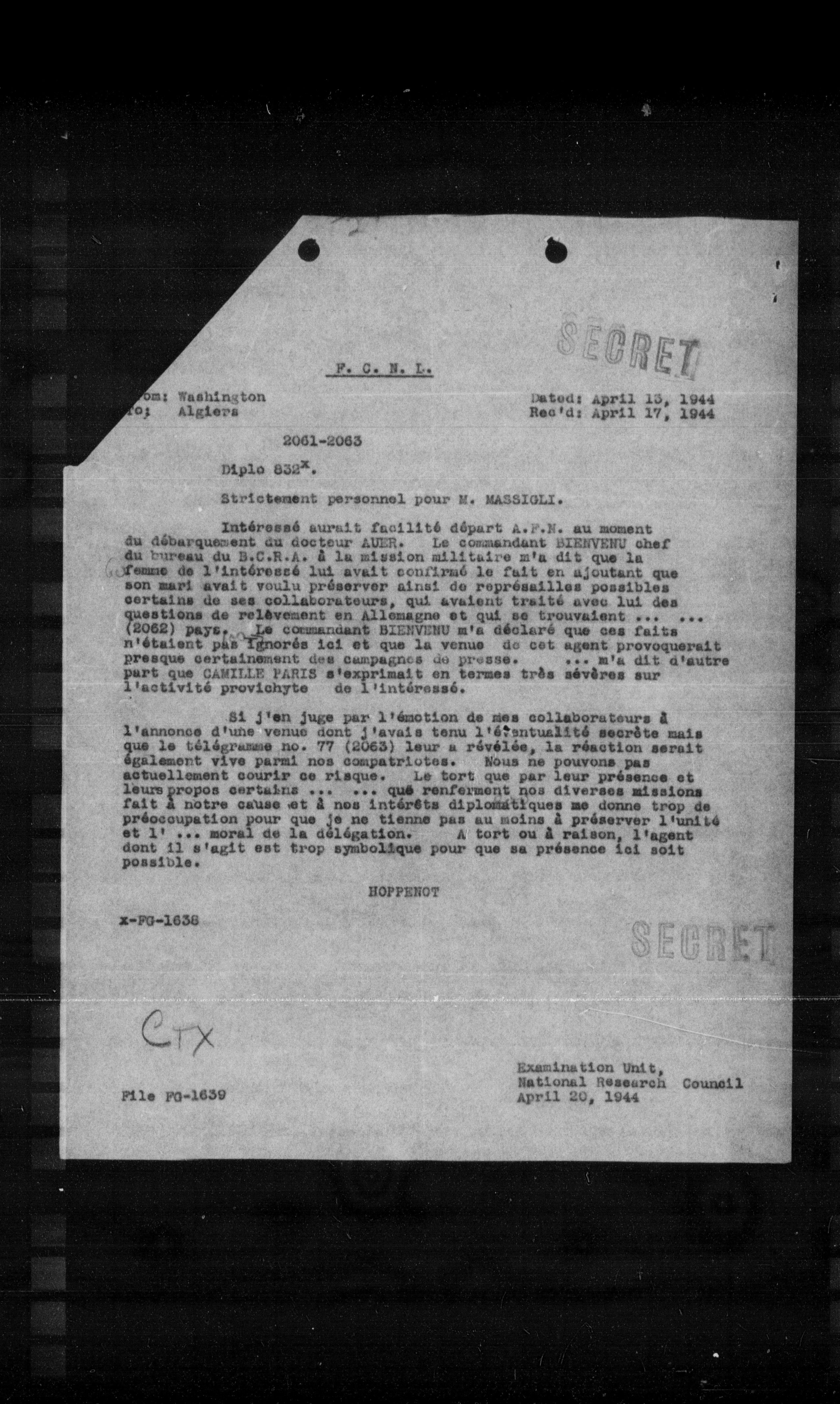 Intéressé aurait facilité départ A.P.N. au moment du débarquement du docteur AUER. Le commandant BIENVENU chef du bureau du B.C.R.A. à la mission militaire m'a dit que la femme de l'intéressé lui avait confirmé le fait en ajoutant que son mari avait voulu préserver ainsi de représailles possibles certains de ses collaborateurs, qui avaient traité avec lui des questions de relèvement en Allemagne et qui se trouvaient (2062) pays. Le commandant BIENVENU m'a déclaré que ces faits n'étaient pas ignorés ici et que la venue de cet agent provoquerait presque certainement des campagnes de presse. ... m'a dit d'autre part que CAMILLE PARIS s'exprimait en termes très sévères sur l'activité proviohyte de l'intéressé.