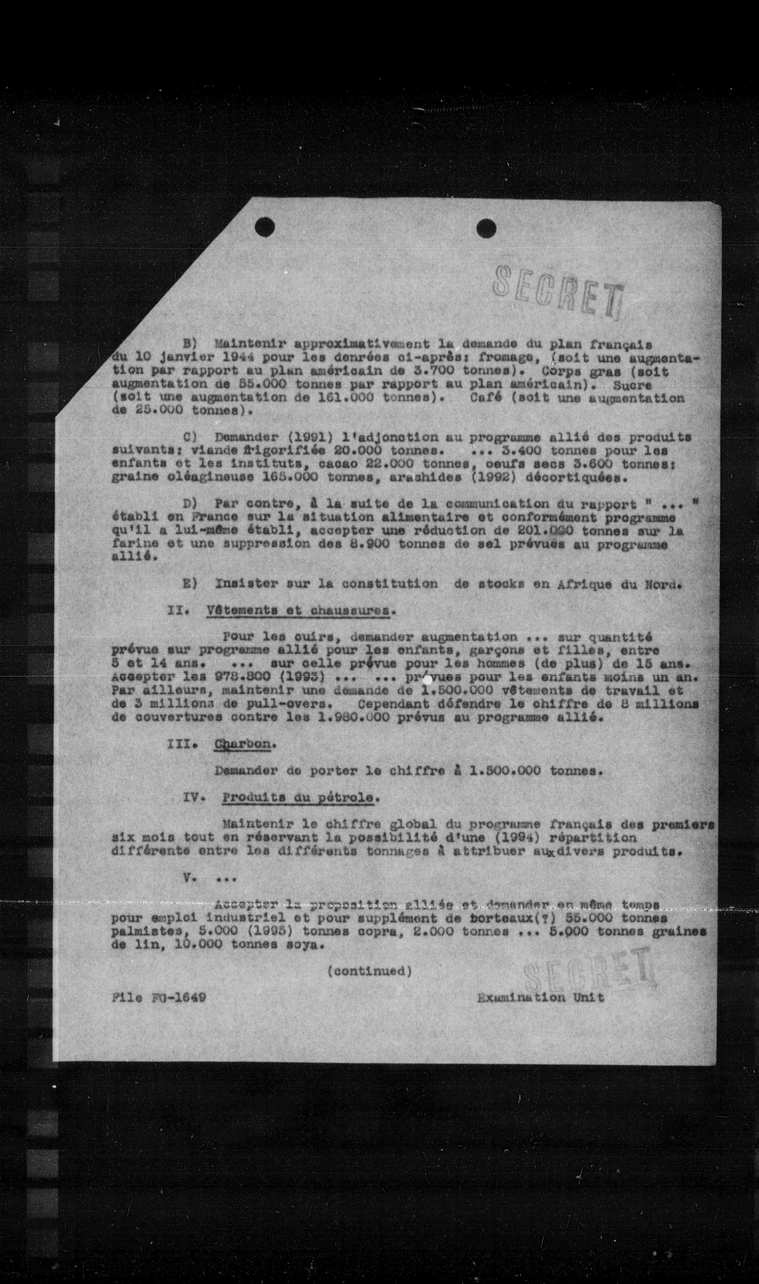 B) Maintenir approximativement la demande du plan français du 10 janvier 1944 pour les denrées ci-après: fromage, (soit une augmentation par rapport au plan américain de 3.700 tonnes). Corps gras (soit augmentation de 55.000 tonnes par rapport au plan américain). Sucre (soit une augmentation de 161.000 tonnes). Café (soit une augmentation de 25.000 tonnes).