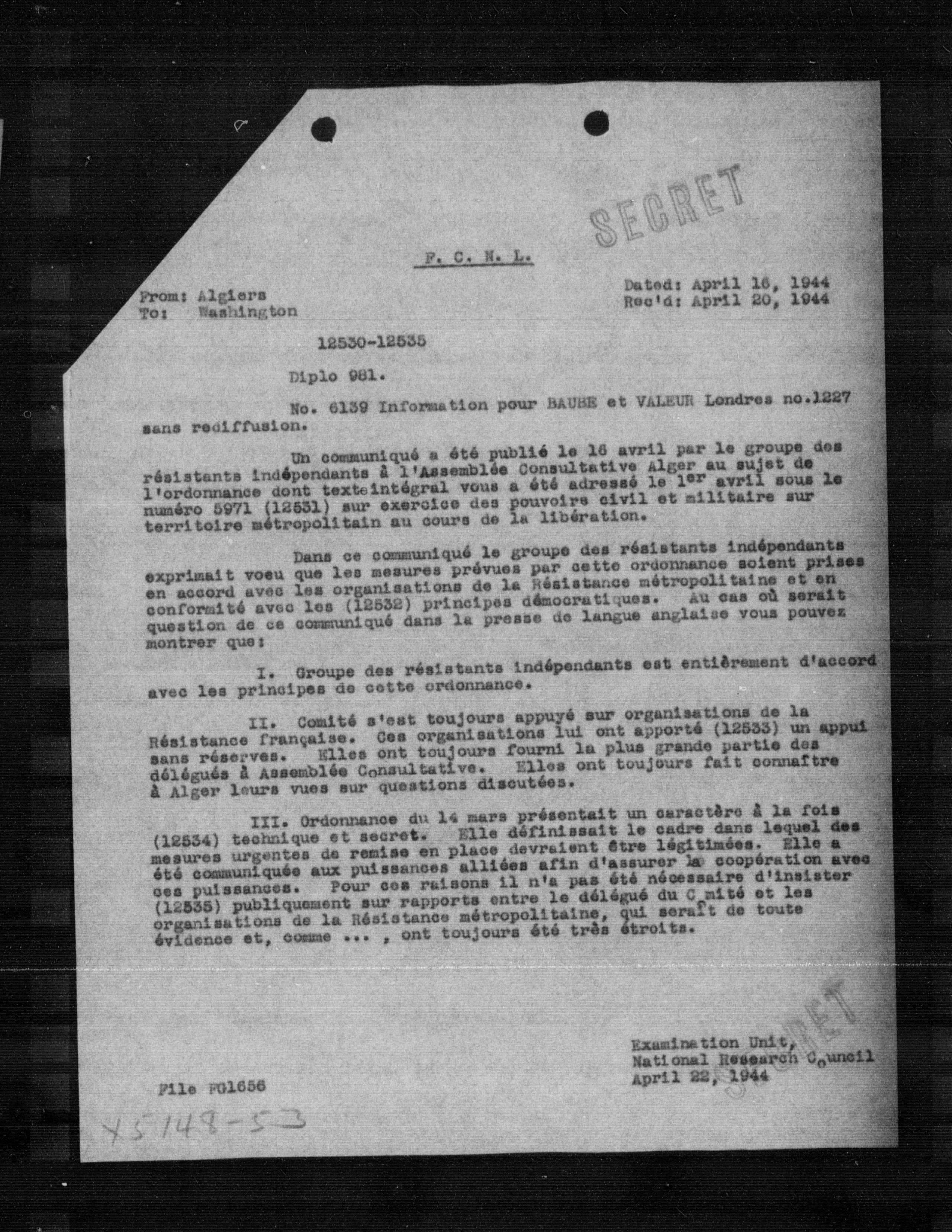 Dans ce communiqué le groupe des résistants indépendants exprimait vous que les mesures prévues par cette ordonnance soient prises en accord avec les organisations de la Résistance métropolitaine et en conformité avec les (12532) principes démocratiques. Au cas où serait question de ce communiqué dans la presse de langue anglaise vous pouvez montrer que: