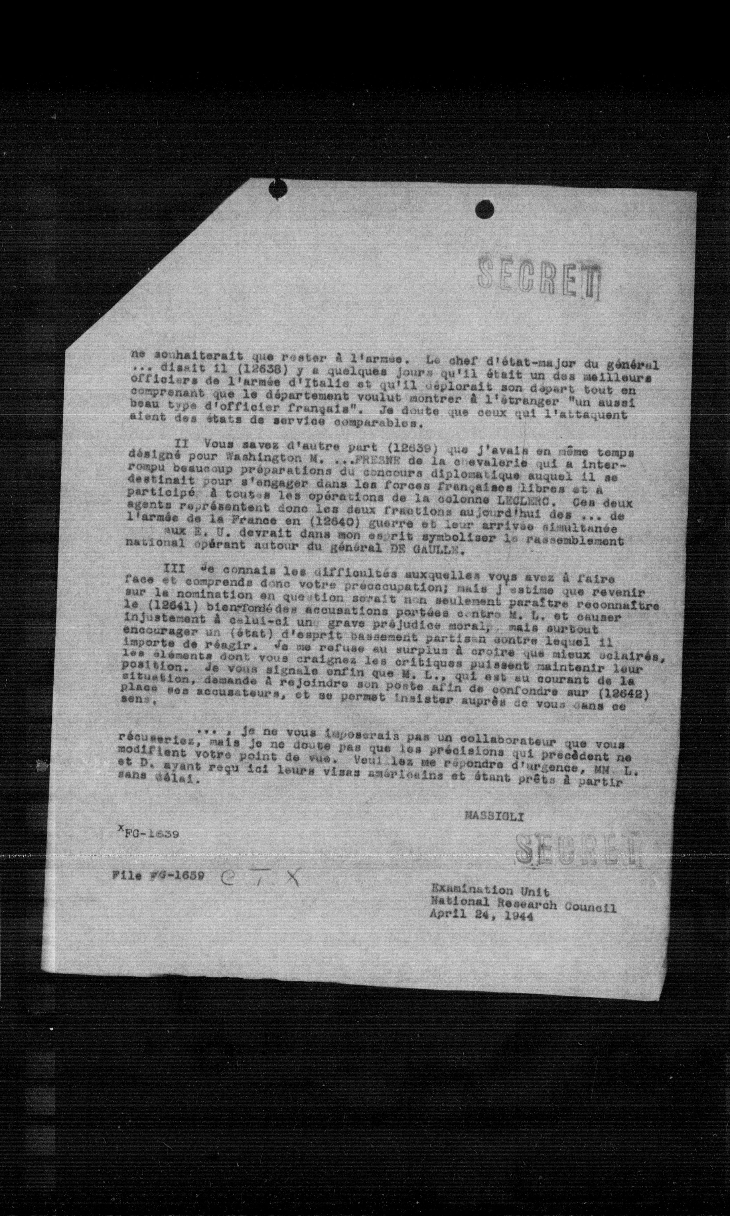 II Vous savez d'autre part (12639) que j'avais en même temps désigné pour Washington M. ... PRESNE de la chevalerie qui a interrompu beaucoup préparations du concours diplomatique auquel il se destinait pour s'engager dans les forces françaises libres et a participé à toutes les opérations de la colonne LESLENG. Ces deux agents représentent donc les deux fractions aujourd'hui des ... de l'armée de la France en (12640) guerre et leur arrivée simultanée aux M. C. devrait dans mon esprit symboliser le rassemblement national opérant autour du général DE GAULLE.