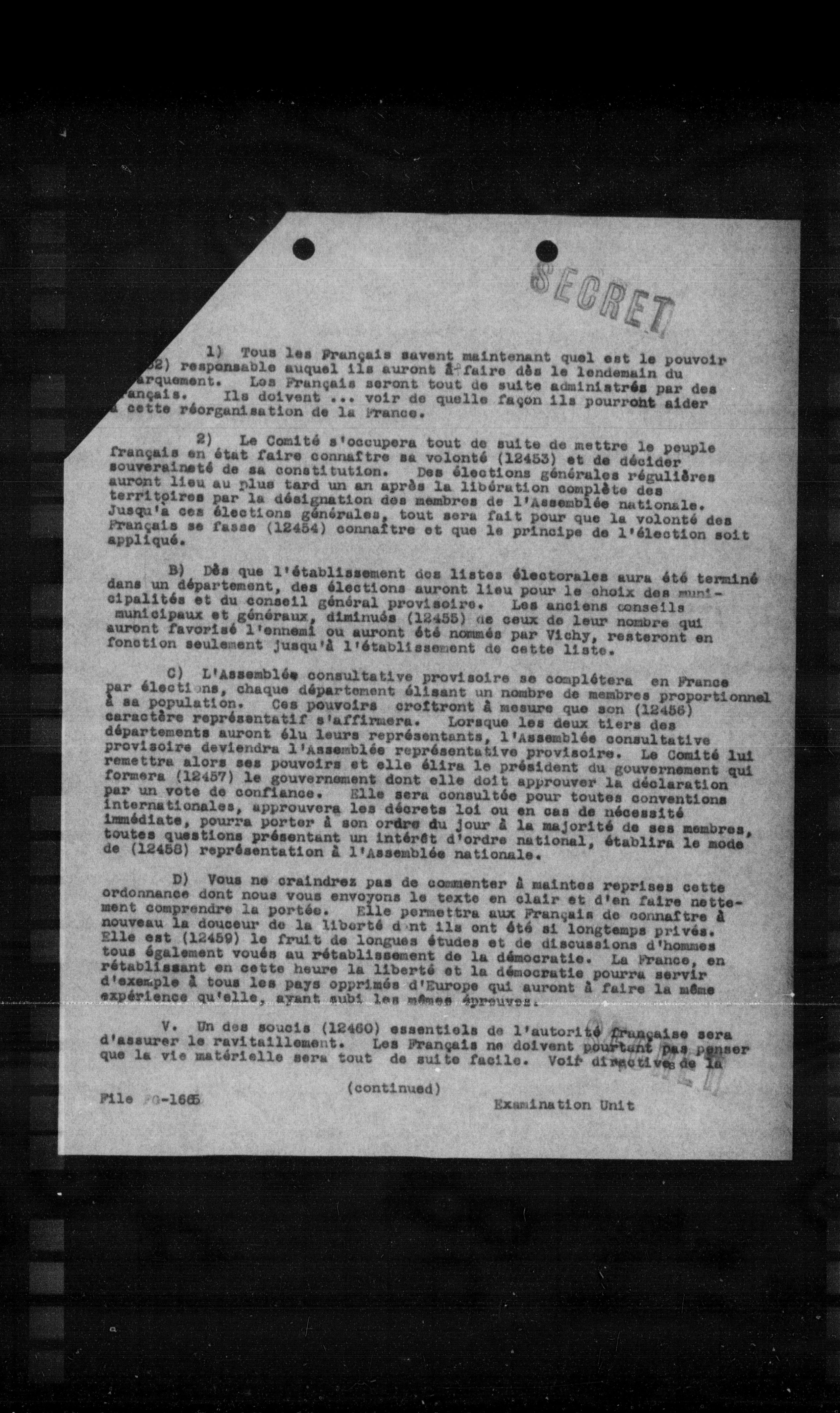 2) Le Comité s'occupera tout de suite de mettre le peuple français en état d'aire connaître sa volonté (12453) et de décider souveraineté de sa constitution. Des élections générales régulières auront lieu au plus tard un an après la libération complète des territoires par la désignation des membres de l'Assemblée nationale. Jusqu'à ces élections générales, tout sera fait pour que la volonté des Français se fasse (12454) connaître et que le principe de l'élection soit appliqué.