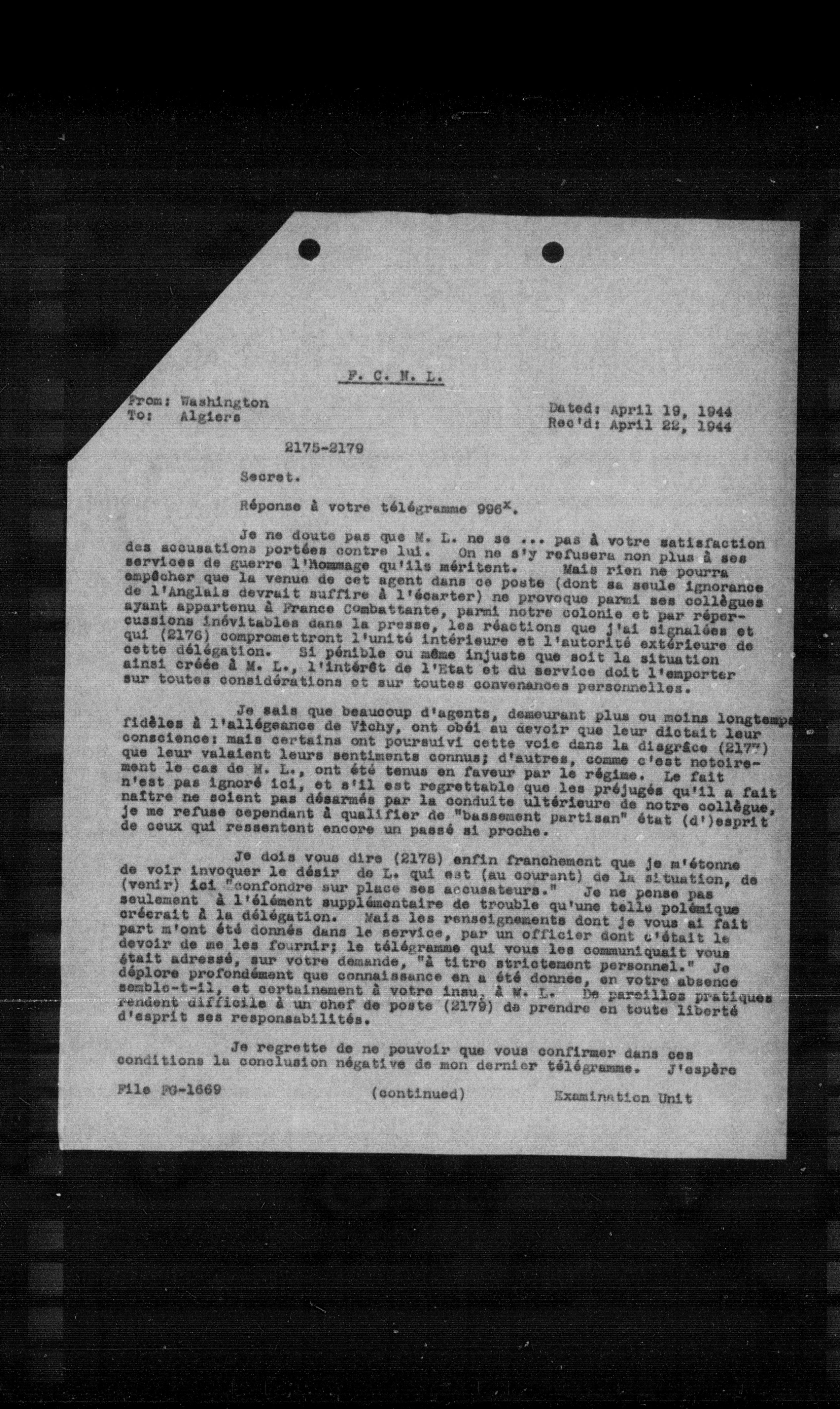 Je ne doute pas que M. L. ne se ... pas à votre satisfaction des accusations portées contre lui. On ne s'y refusera non plus à ses services de guerre l'Hommage qu'ils méritent. Mais rien ne pourra empêcher que la venue de cet agent dans ce poste (dont sa seule ignorance de l'anglais devrait suffire à l'écarter) ne provoque parmi ses collègues ayant appartenu à France Combattante, parmi notre colonie et par répercussions inévitables dans la presse, les réactions que j'ai signalées et qui (2176) compromettront l'unité intérieure et l'autorité extérieure de cette délégation. Si pénible ou même injuste que soit la situation ainsi créée à M. L., l'intérêt de l'Etat et du service doit l'emporter sur toutes considérations et sur toutes convenances personnelles.