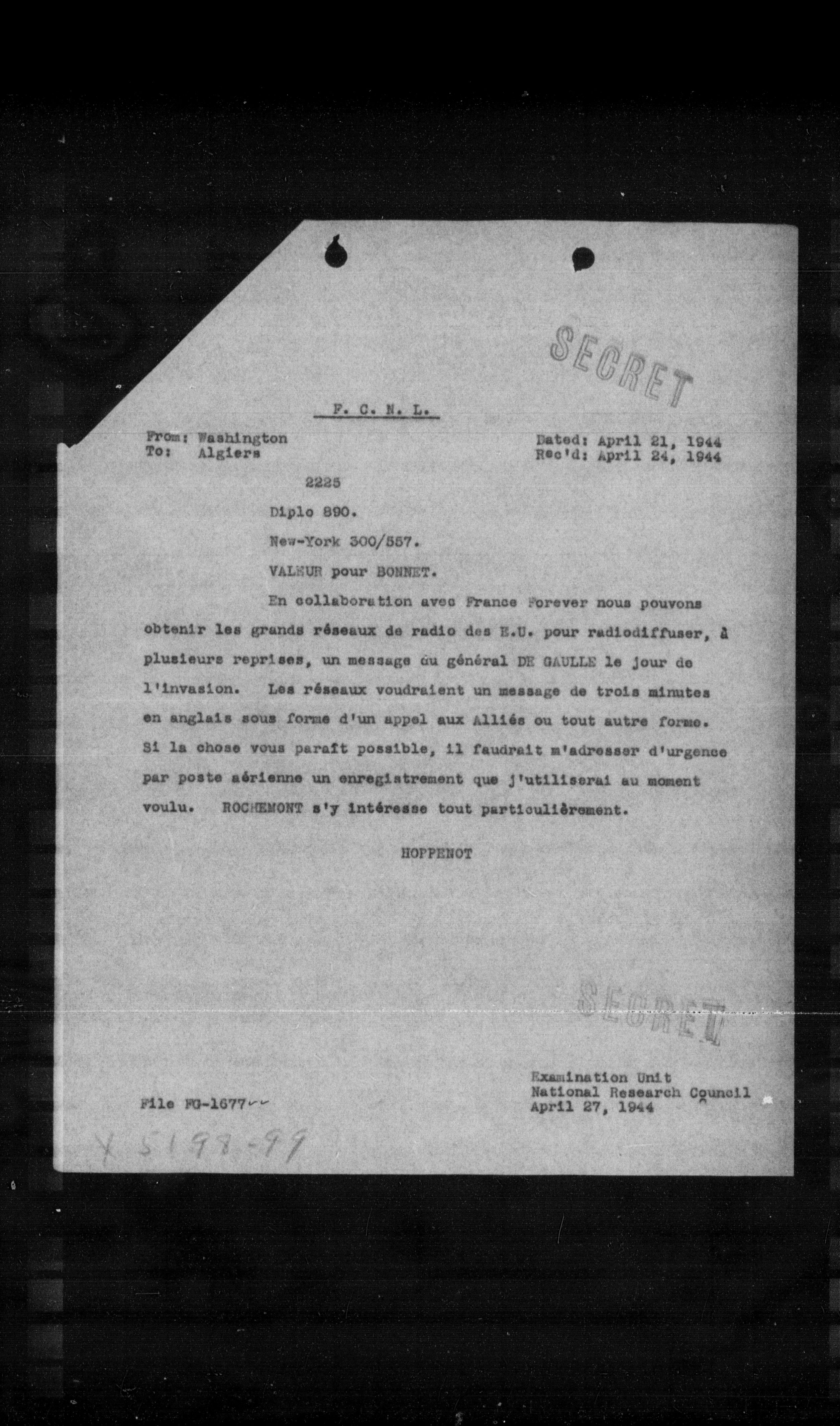 En collaboration avec France Forever nous pouvons obtenir les grands réseaux de radio des E.U. pour radiodiffuser, à plusieurs reprises, un message ou général DE GAULLE le jour de l'invasion. Les réseaux voudraient un message de trois minutes en anglais sous forme d'un appel aux alliés ou tout autre forme. Si la chose vous paraft possible, il faudrait m'adresser d'urgence par poste aérienne un enregistrement que j'utiliserai au moment voulu. ROGHEMONT s'y intéresse tout particulièrement.