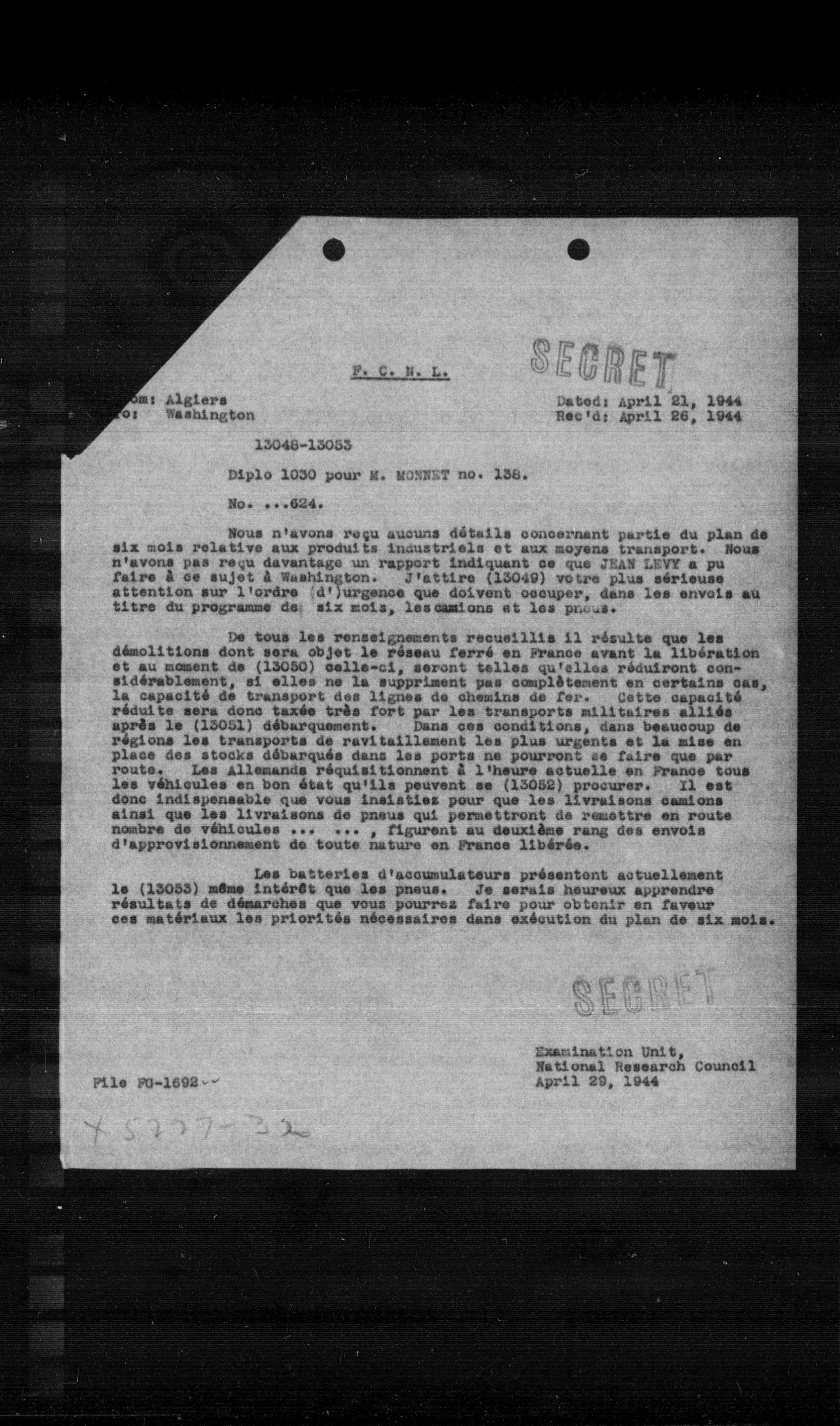 Nous n'avons reçu aucune détails concernant partie du plan de six mois relative aux produits industriels et aux moyens transport. Nous n'avons pas reçu davantage un rapport indiquant ce que JEAN LEVY a pu faire à ce sujet à Washington. J'attire (13049) votre plus sérieuse attention sur l'ordre (d')urgence que doivent oscuper, dans les envois au titre du programme de six mois, les camions et les pneus.