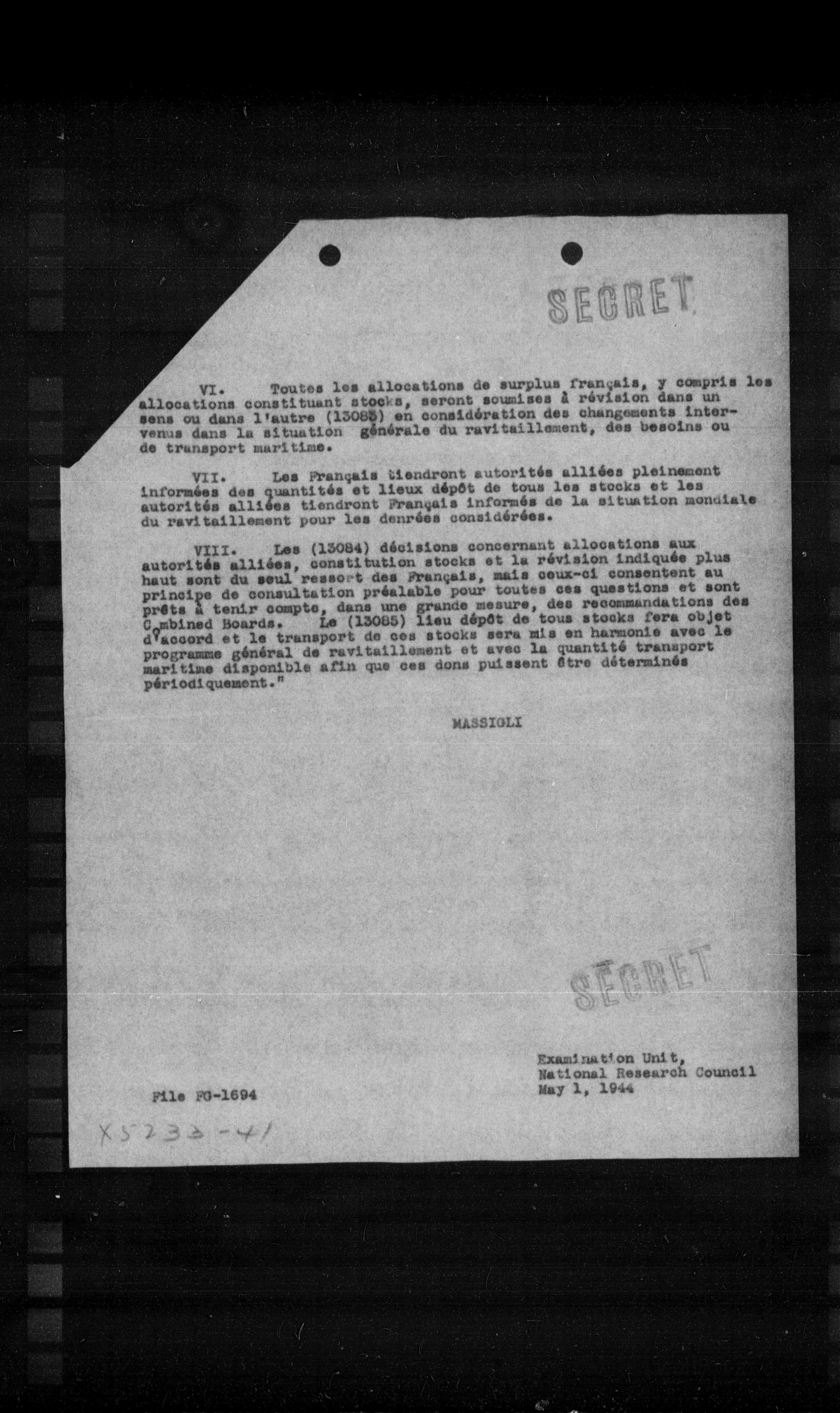 VIII. Les (13084) décisions concernant allocations aux autorités alliées, constitution stocks et la révision indiquée plus haut sont du seul ressort des Frangals, mais ceux-ci consentent au principe de consultation préalable pour toutes ces questions et sont prêts à tenir compte, dans une grande mesure, des recommandations des C,mbined Boards. Le (13085) lieu dépôt de tous stocks fera objet d'accord et le transport de ces stocks sera mis en harmonie avec le programme général de ravitallement et avec la quantité transport maritime disponible afin que ces dons puissent être déterminés périodiquement. ${ }^{2}$