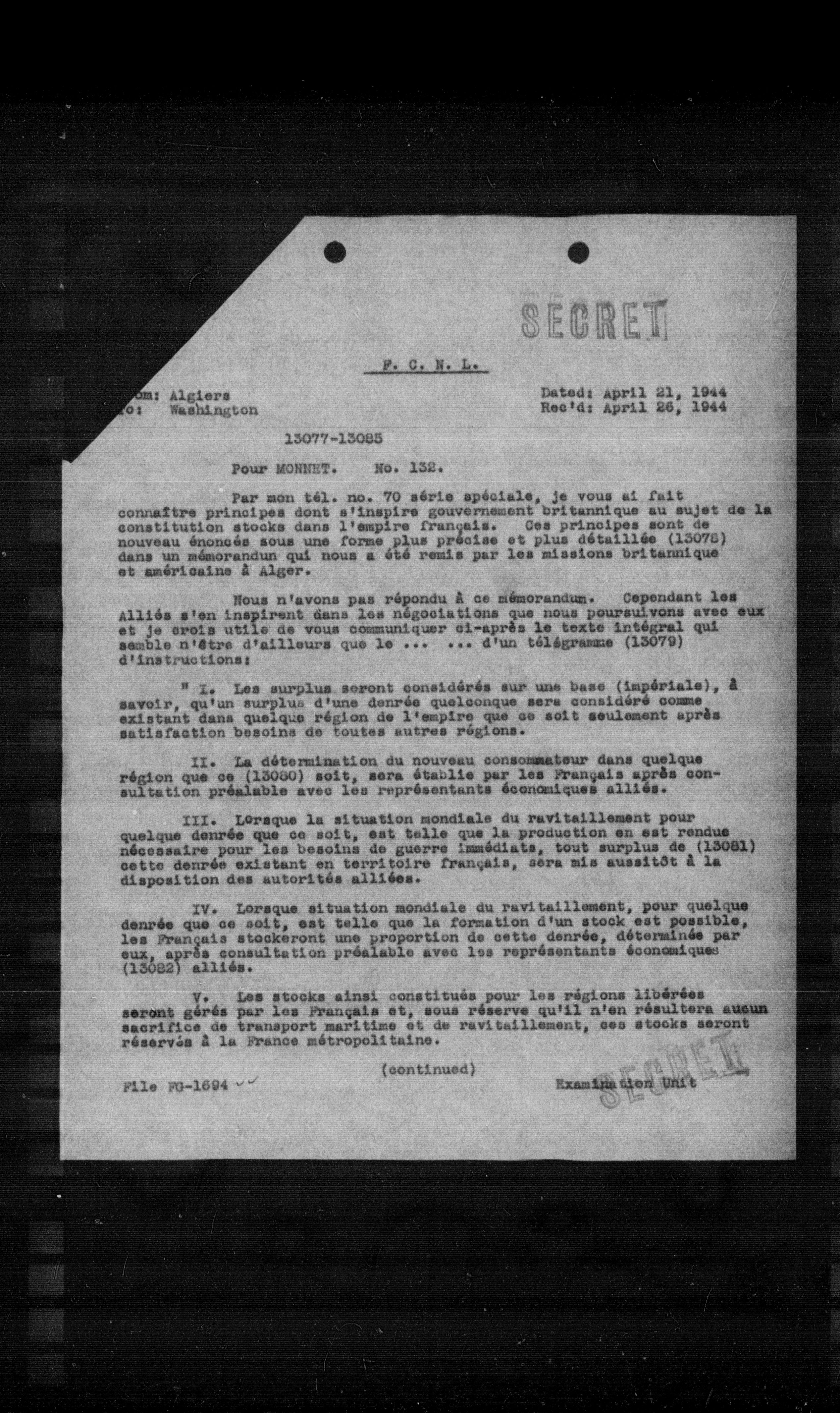 Par mon tel. no. 70 série spéciale, je vous ai fait connaitre principes dont a'inspire gouvernement britannique au sujet de la constitution stocks dans l'empire français. Ces principes sont de nouveau énoncés sous une forme plus précise et plus détaillée (13075) dans un mémorandum qui nous a été remis par les missions britannique et américaine à Alger.