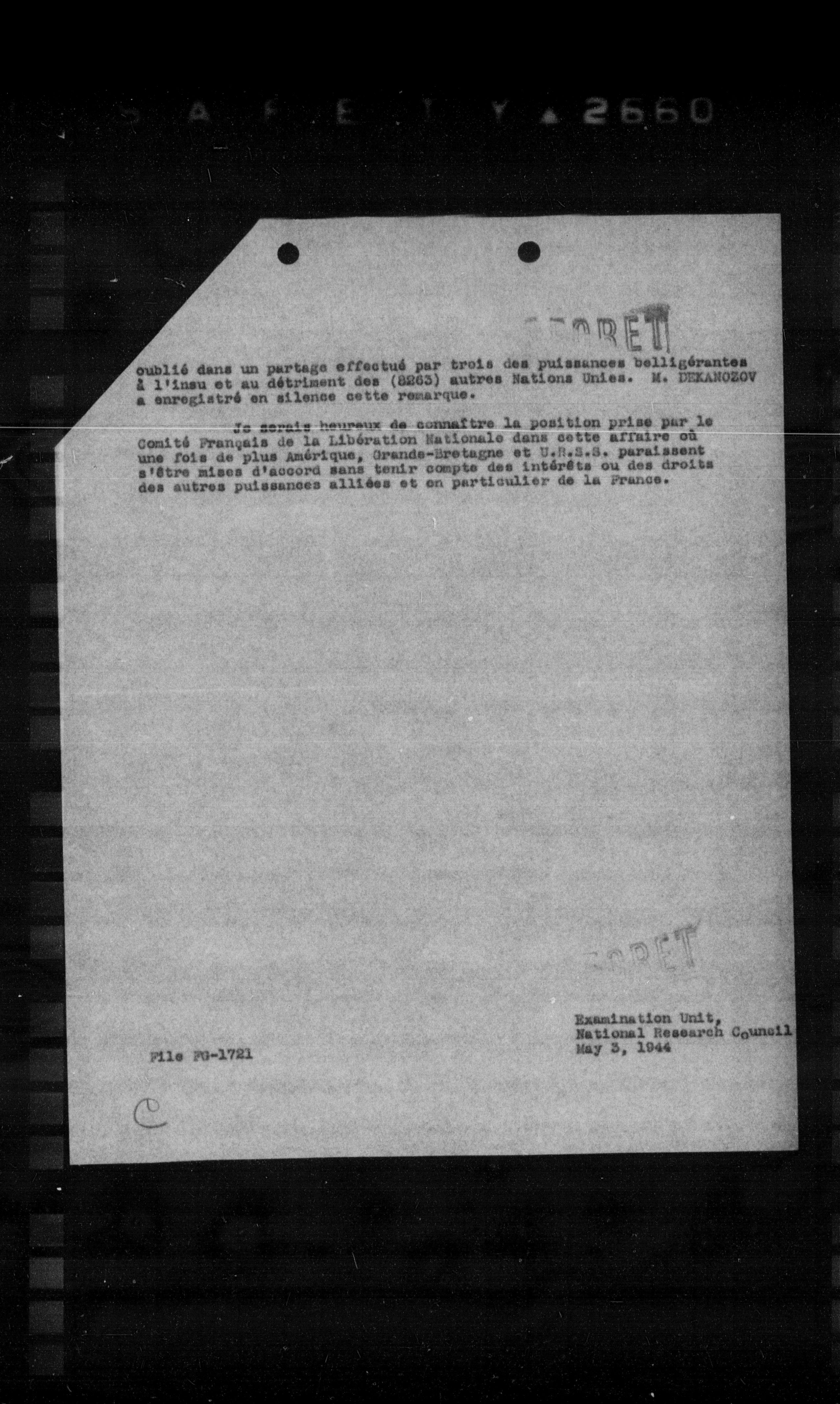 Comité Prangais de la Libération Nationale dans cette affaire où une fois de plus Amérique, Grande-Bretagne et U.S.S.S. paraissent s'être mises d'accord sans tenir compte des intérêts ou des droits des autres puissances alliées et en particulier de la France.