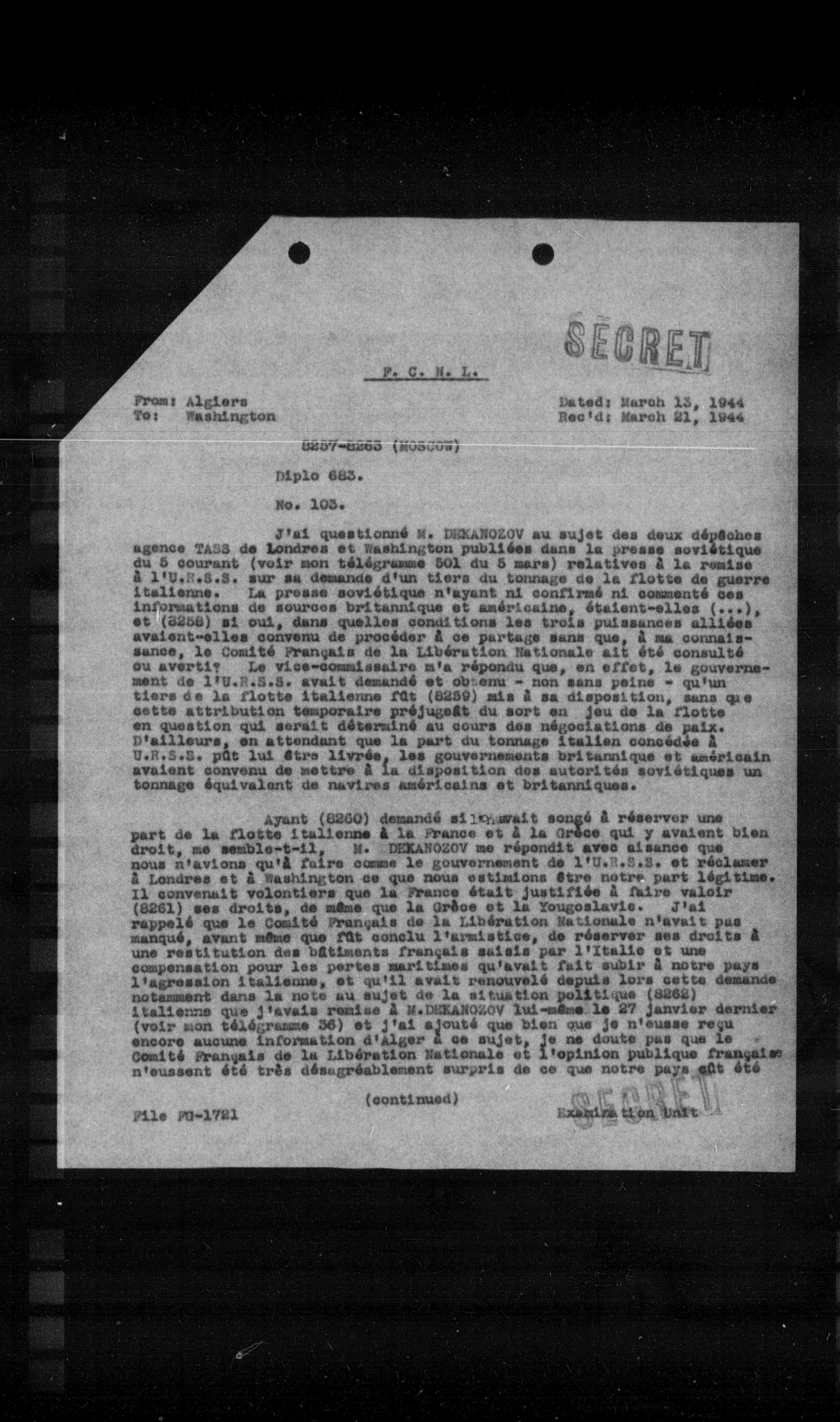 J'ai questionné M. DEKANOZOV au sujet des deux dépêches agence TASS de Londres et Washington publiées dans la presse soviétique du 5 courant (voir mon télégramme 501 du 5 mars) relatives à la remise à l'U.S.S.S. sur sa demande d'un tiers du tonnage de la flotte de guerre italienne. La presse soviétique n'ayant ni confirmé ni commenté ces informations de sources britannique et américaine, étaient-elles (....), et (8258) si oui, dans quelles conditions les trois puissances alliées avaient-elles convenu de procéder à ce partage sans que, à ma connaissance, le Comité Français de la Libération Nationale ait été consulté ou averti? Le vice-commissaire m'a répondu que, en effet, le gouvernement de l'U.S.S.S. avait demandé et obtenu - non sans peine - qu'un tiers de la flotte italienne fût (8259) mis à sa disposition, sans que cette attribution temporaire préjugât du sort en jeu de la flotte en question qui serait déterminé au cours des négociations de paix. D'ailleurs, en attendant que la part du tonnage italien concédée à l'U.S.S.S. pût lui être livrée, les gouvernements britanniques et américain avaient convenu de mettre à la disposition des autorités soviétiques un tonnage équivalent de navires américains et britanniques.