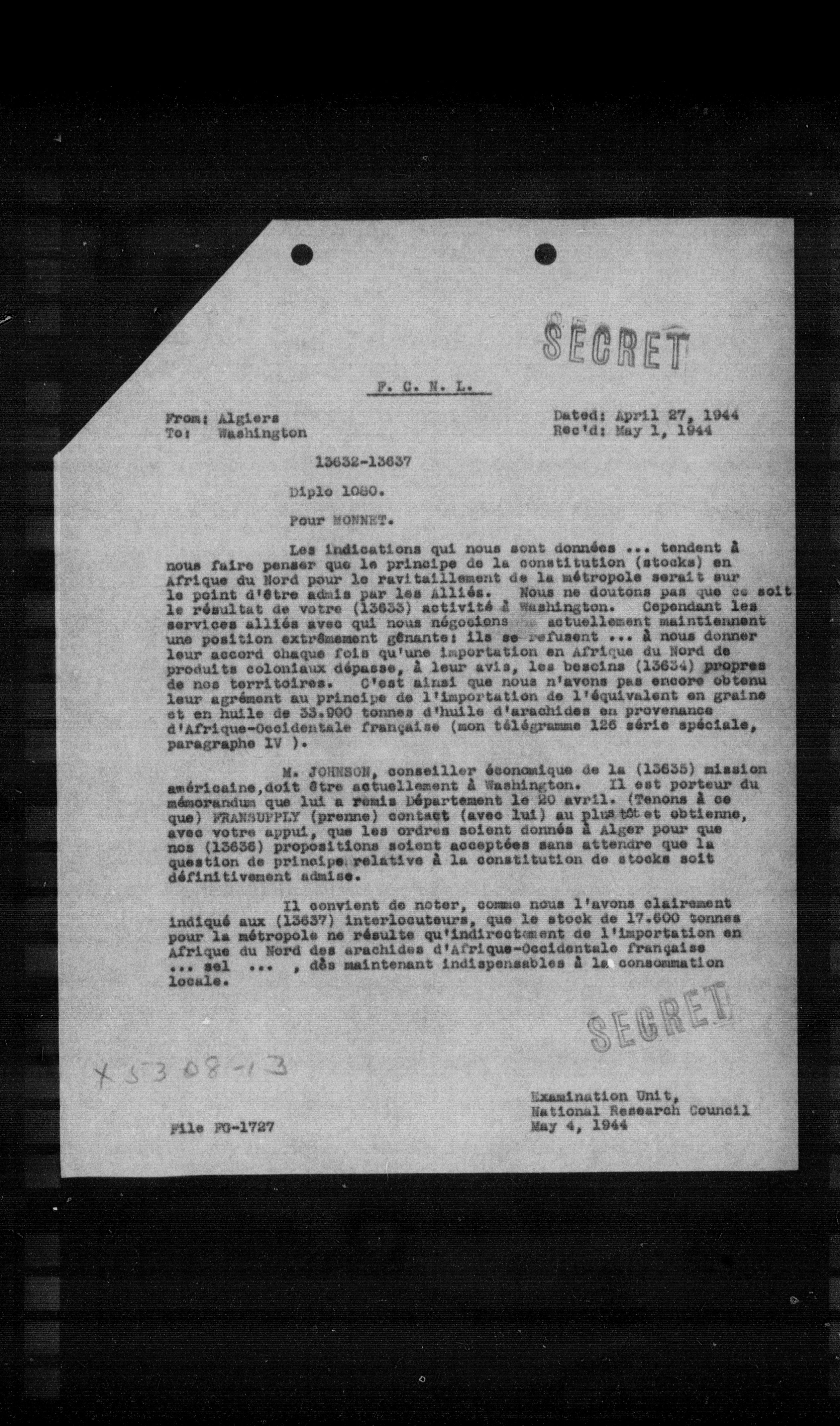 M. JOHNSON, conseiller économique de la (13635) mission américaine, doit être actuellement à Washington. Il est porteur du mémorandum que lui a remis Département le 20 avril. (Tenons à ce que) FRANSDIPEY (prenne) conteste (avec lui) au plutôt et obtienne, avec votre appui, que les ordres soient donnés à Alger pour que nos (13636) propositions soient acceptées sans attendre que la question de principe relative à la constitution de stocks soit définitivement admise.