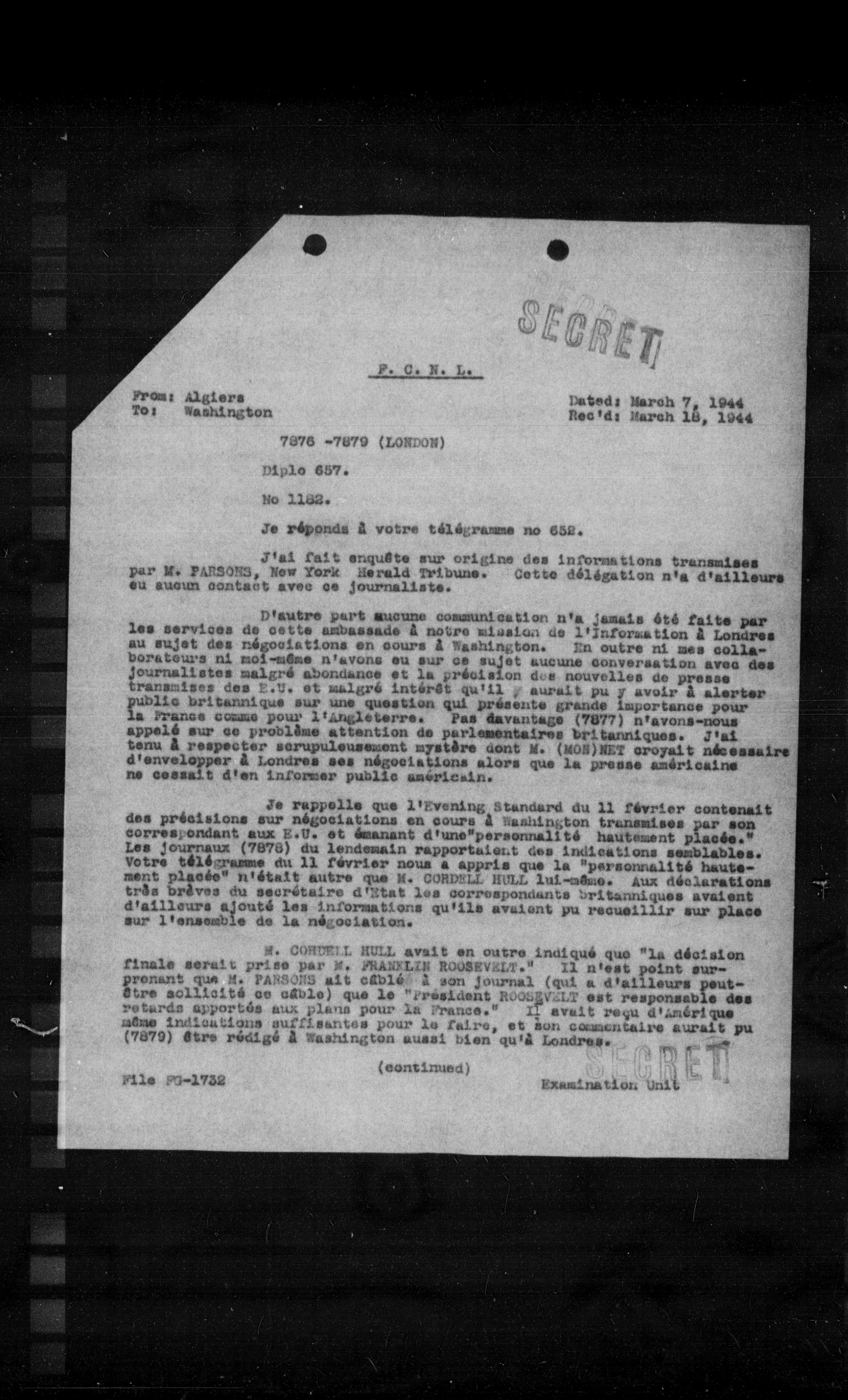 M. CONDELL HULL avait en outre indiqué que "la décision finale serait prise par M. FRANZLIS ROUSSEVELT." Il n'est point surprenant que M. FASSONS ait câblé à son journal (qui a d'ailleurs peut-être sollicité ce câble) que le "Président ROUSSEVELT est responsable des retards apportés aux plans pour la France." Il avait reçu d'Amérique même indications suffisantes pour la faire, et son commentaire aurait pu (7879) être rédigé à Washington aussi bien qu'à Londres.