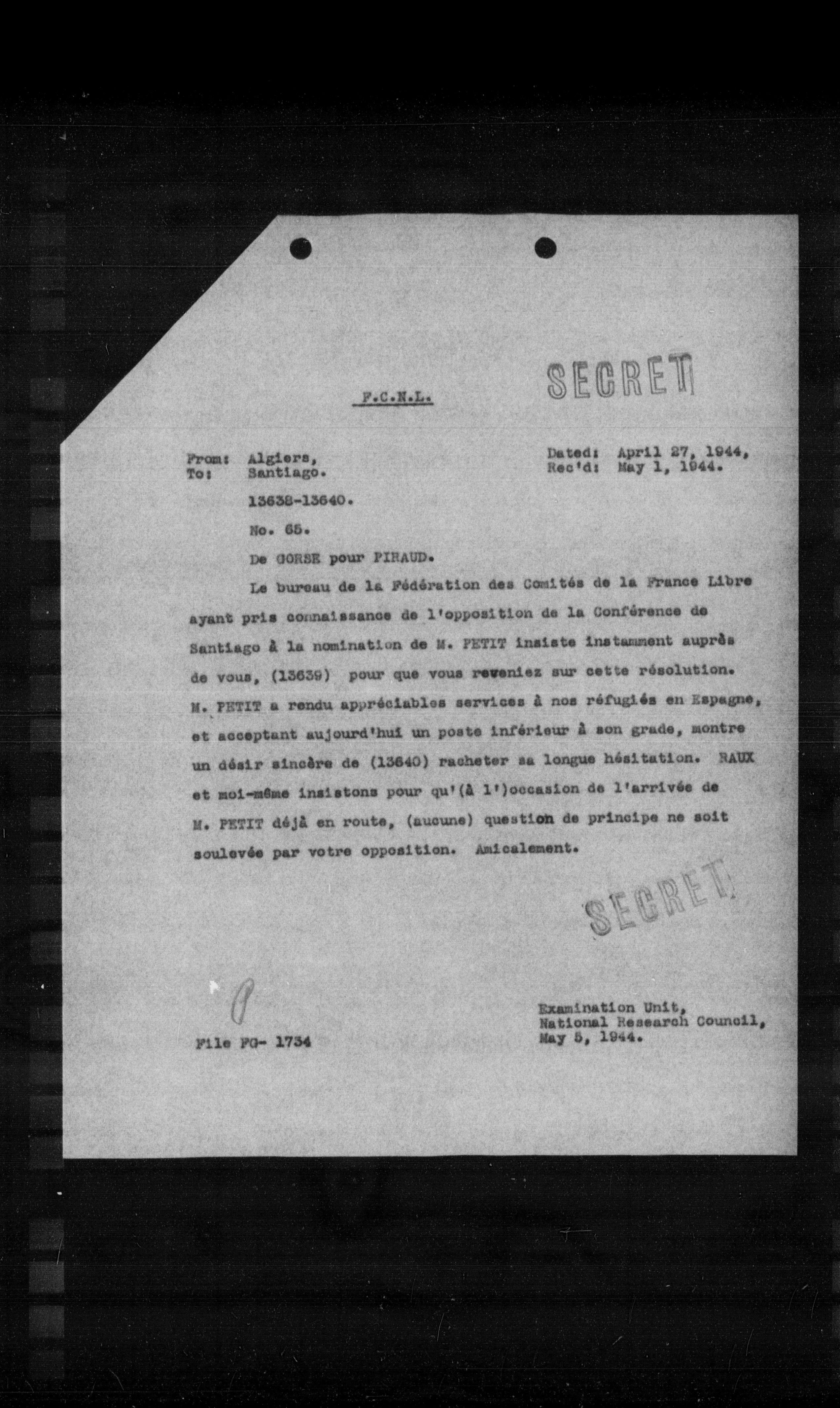 Le bureau de la Fédération des Comités de la France Libre ayant pris connaissance de l'opposition de la Conférence de Santiago à la nomination de M. PETIT insiste instamment auprès de vous, (13639) pour que vous reveniez sur cette résolution. M. PETIT a rendu appréciables services à nos réfugiés en Espagne, et acceptant aujourd'hui un poste inférieur à son grade, montre un désir sincère de (13640) racheter sa longue hésitation. RAUX et moi-meme insistons pour qu' (a l') occasion de l'arrivée de M. PETIT déjà en route, (aucune) question de principe ne soit soulevée par votre opposition. Amicalement.