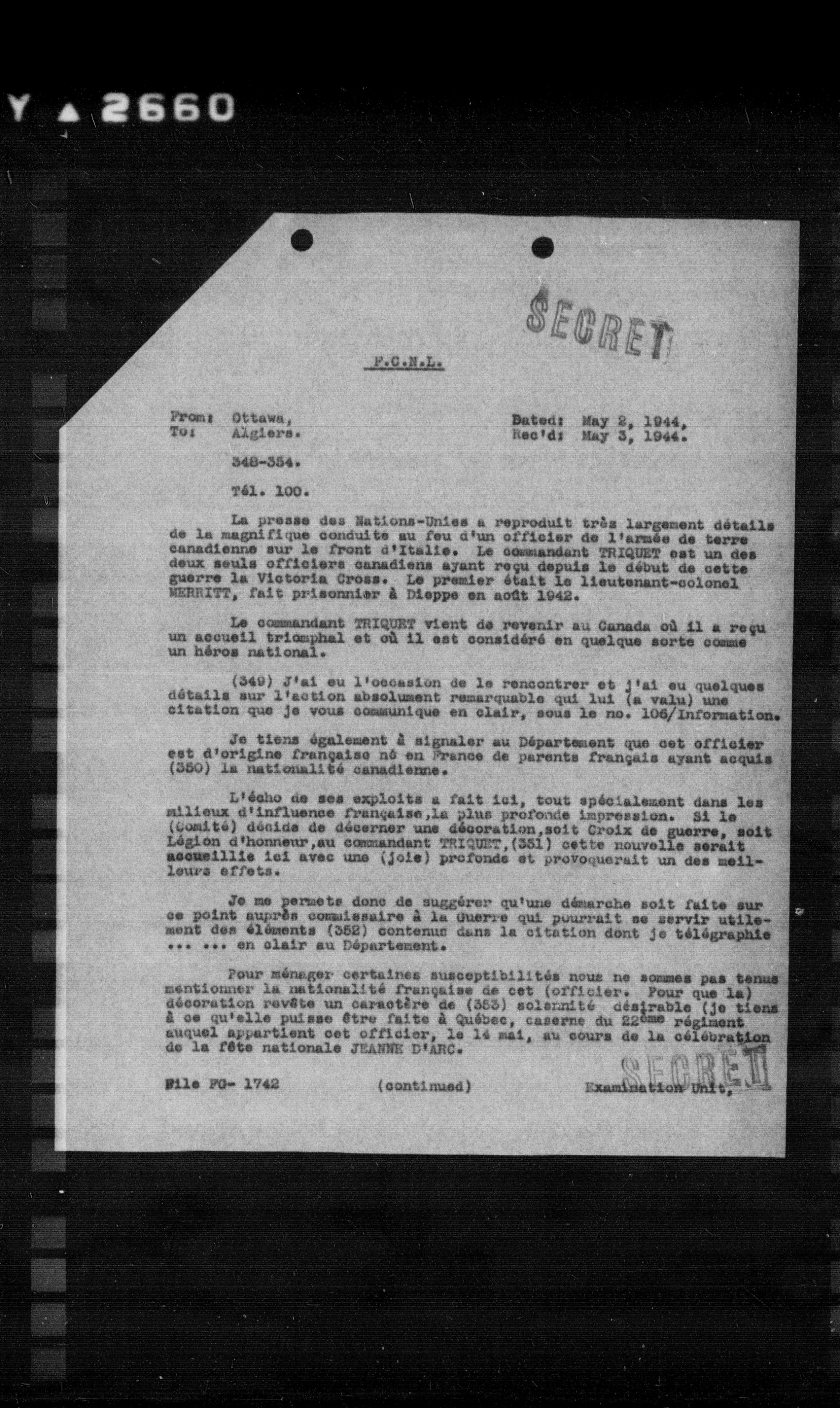 Pour ménager certaines susceptibilités nous ne sommes pas tenus mentionner la nationalité française de cet (officier. Pour que la) décoration revête un caractère de (353) solennité désirable (je tiens à ce qu'elle puisse être faite à Québec, caserne du 22ème régiment auquel appartient cet officier, le 14 mai, au cours de la célébration de la fête nationale JEANNE D'ARC.