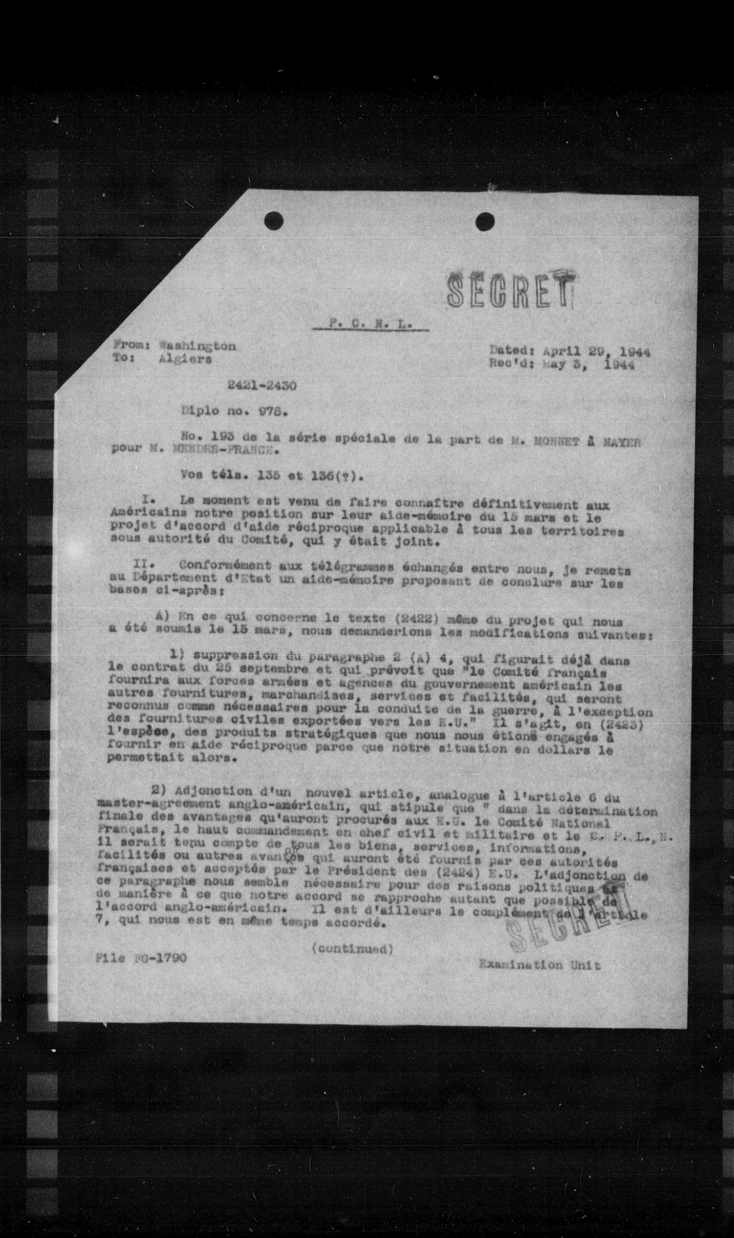 2) Adjonction d'un nouvel article, analogue à l'article 6 du master-agreement anglo-américain, qui stipule que "dans la détermination finale des avantages qu'auront procurés aux E.U. le Comité National Français, le haut commandement en chef civil et militaire et le E. P. L., il serait tenu compte de tous les biens, services, informations, facilités ou autres avantages qui auront été fournis par ces autorités françaises et acceptés par le Président des (2424) E.U. L'adjonction de ce paragraphe nous semble nécessaire pour des raisons politiques de manière à ce que notre accord se rapproche autant que possible de l'accord anglo-américain. Il est d'ailleurs le complément de l'article 7, qui nous est en même temps accordé.