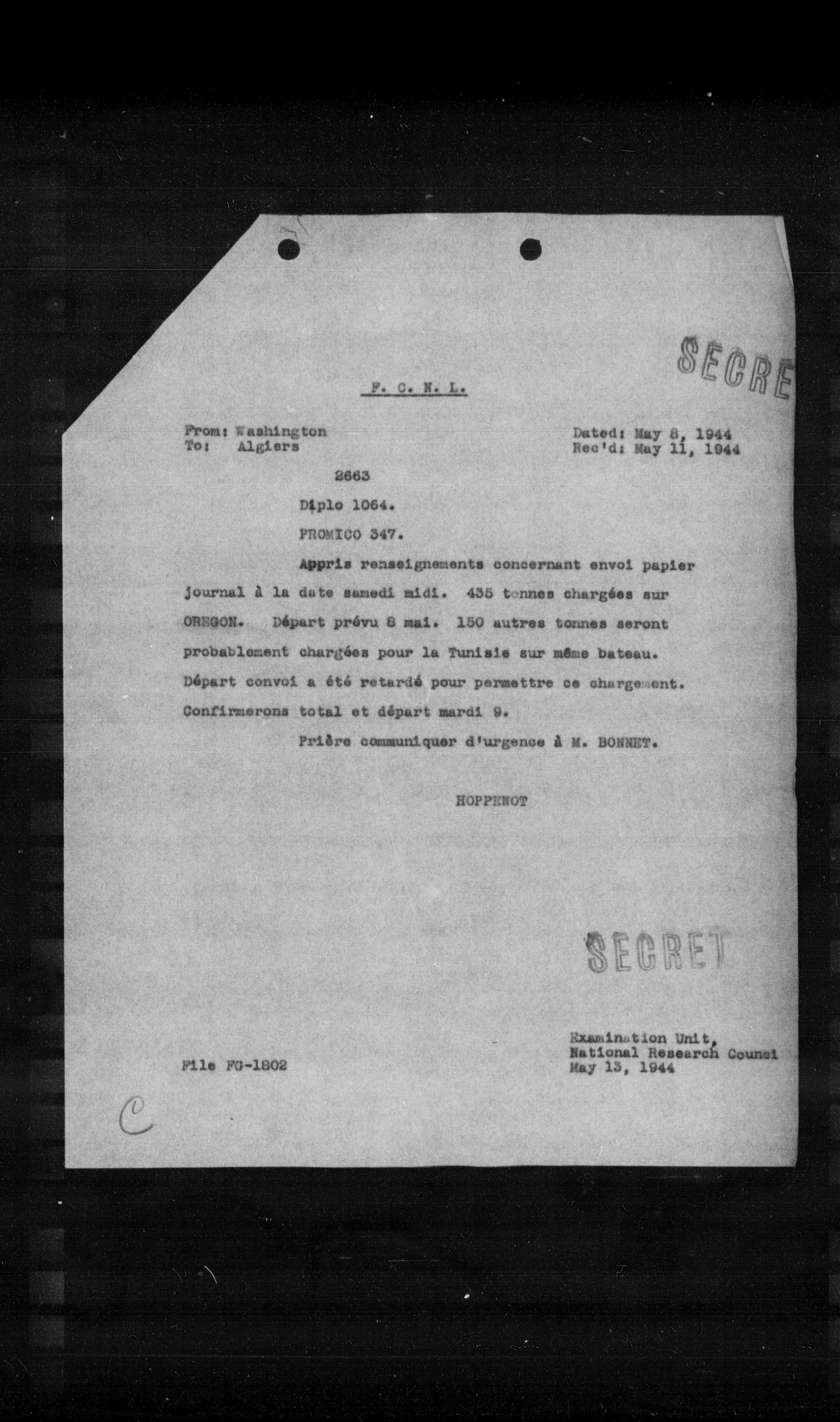 Appris renseignements concernant envoi papier journal à la date samedi midi. 435 tonnes chargées sur GREGON. Départ prévu 8 mai. 150 autres tonnes seront probablement chargées pour la Tunisie sur même bateau. Départ convoi a été retardé pour permettre ce chargement. Confirmerons total et départ mardi 9.