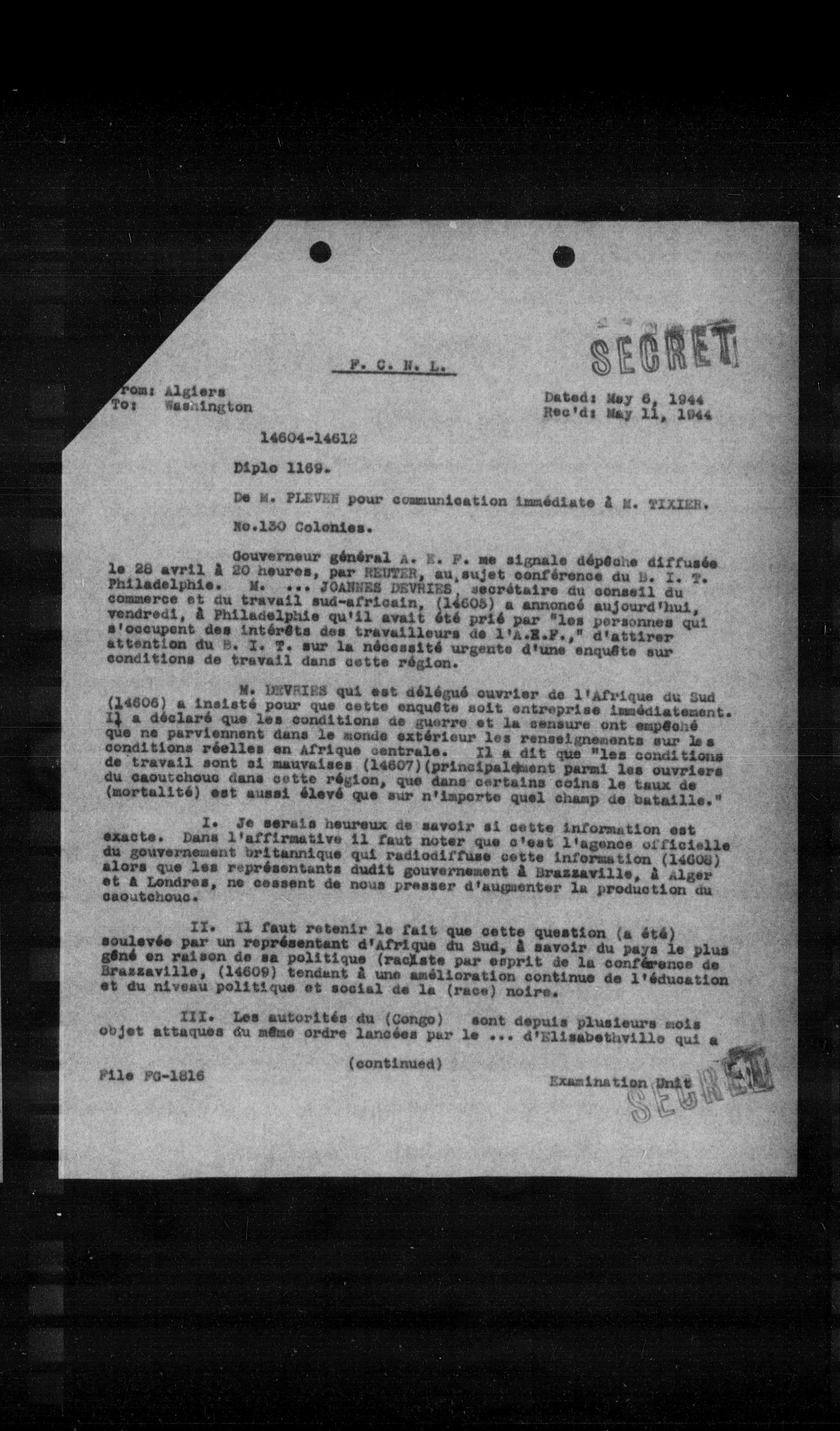 Gouverneur général A. E. F. me signale dépêche diffusée le 28 avril à 20 heures, par NEUTER, au sujet conférence du B. I. T. Philadelphie. M. JOANNES DEVRIES, secrétaire du conseil du commerce et du travail sud-africain, (14606) a annoncé aujourd'hui, vendredi, à Philadelphie qu'il avait été prié par "les personnes qui s'occupent des intérêts des travailleurs de l'A.M.F.," d'attirer attention du B. I. T. sur la nécessité urgente d'une enquête sur conditions de travail dans cette région.
