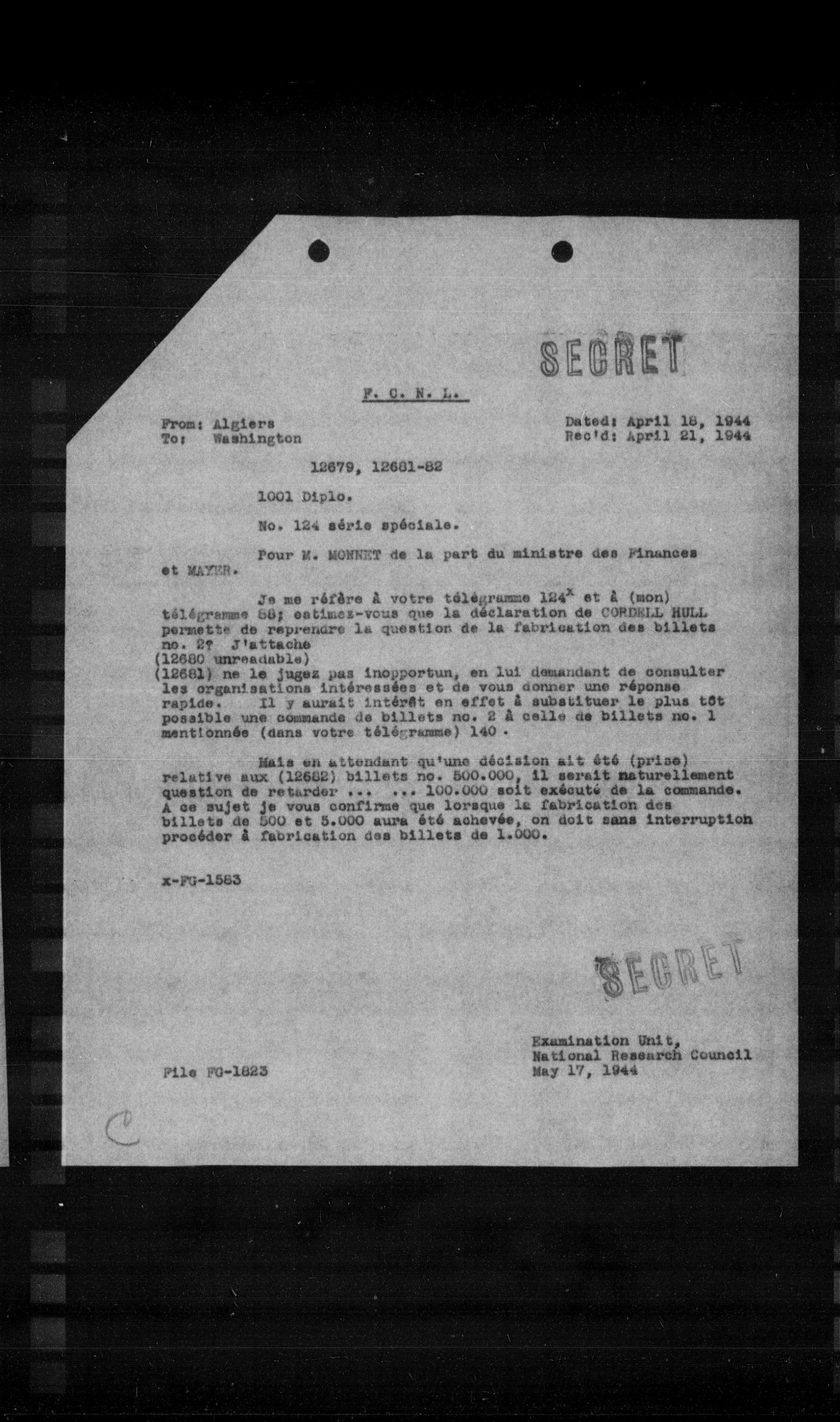 Je me réfère à votre télégramme $124^{e}$ et à (mon) télégramme 88; estimez-vous que la déclaration de CORDELL HULL permette de reprendre la question de la fabrication des billets no. 27 J'attache