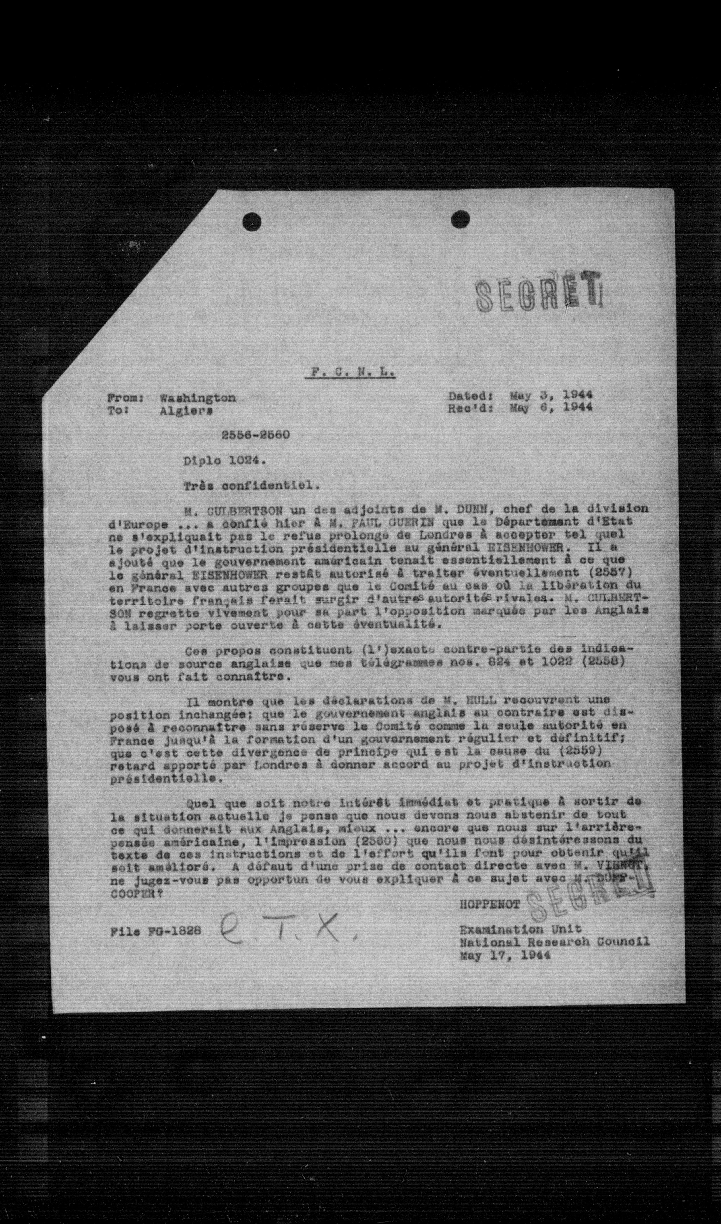 M. CULBERTSON un des adjoints de M. DUNN, chef de la division d'Europe ... a confié hier à M. PAUL GUERIN que le Département d'Etat ne s'expliquait pas le refus prolongé de Londres à accepter tel quel le projet d'instruction présidentielle au général EISENHOWER. Il a ajouté que le gouvernement américain tenait essentiellement à ce que le général EISENHOWER restât autorisé à traiter éventuellement (2557) en France avec autres groupes que le Comité au cas où la libération du territoire français ferait surgir d'autre autorit@ rivalez. M. CULBERTSON regrette vivement pour sa part l'opposition marquée par les Anglais à laisser porte ouverte à cette éventualité.