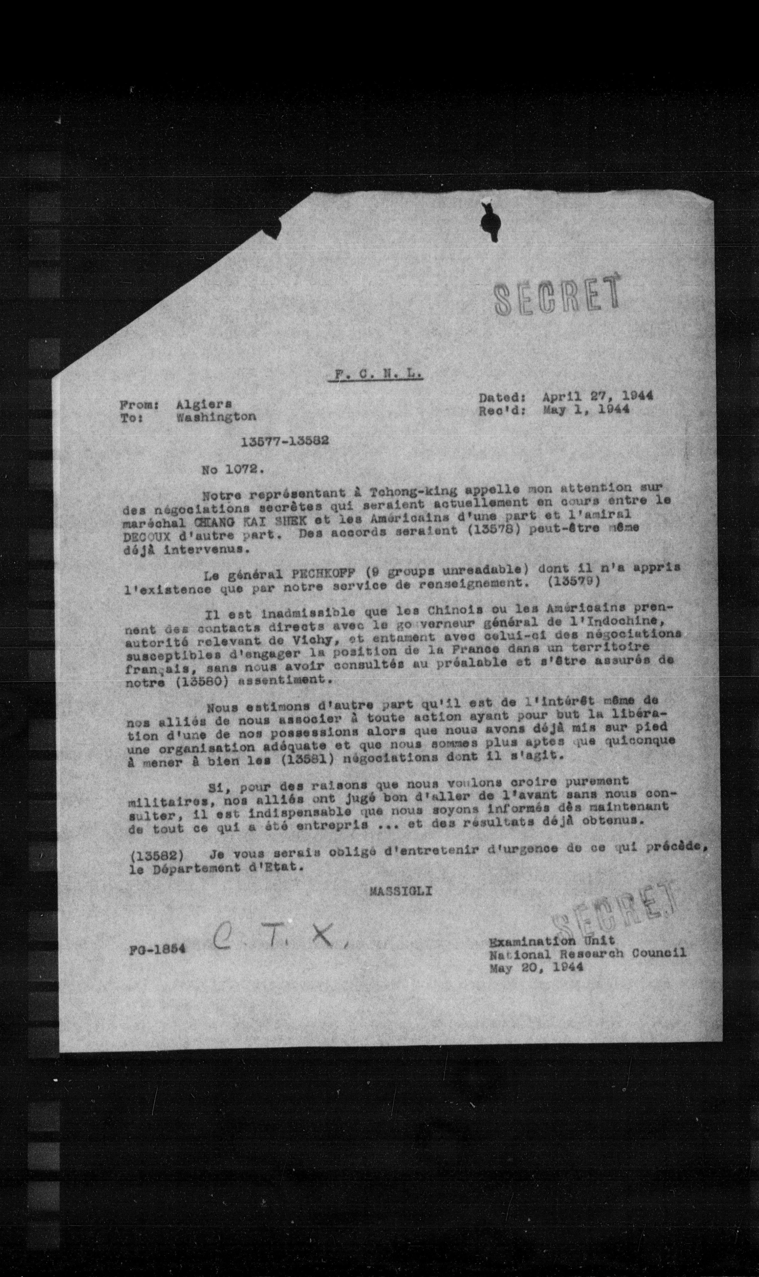 Le général PECKKOFF (9 groupes unreadables) dont il n'a appris l'existence que par notre service de renseignement. (13579)