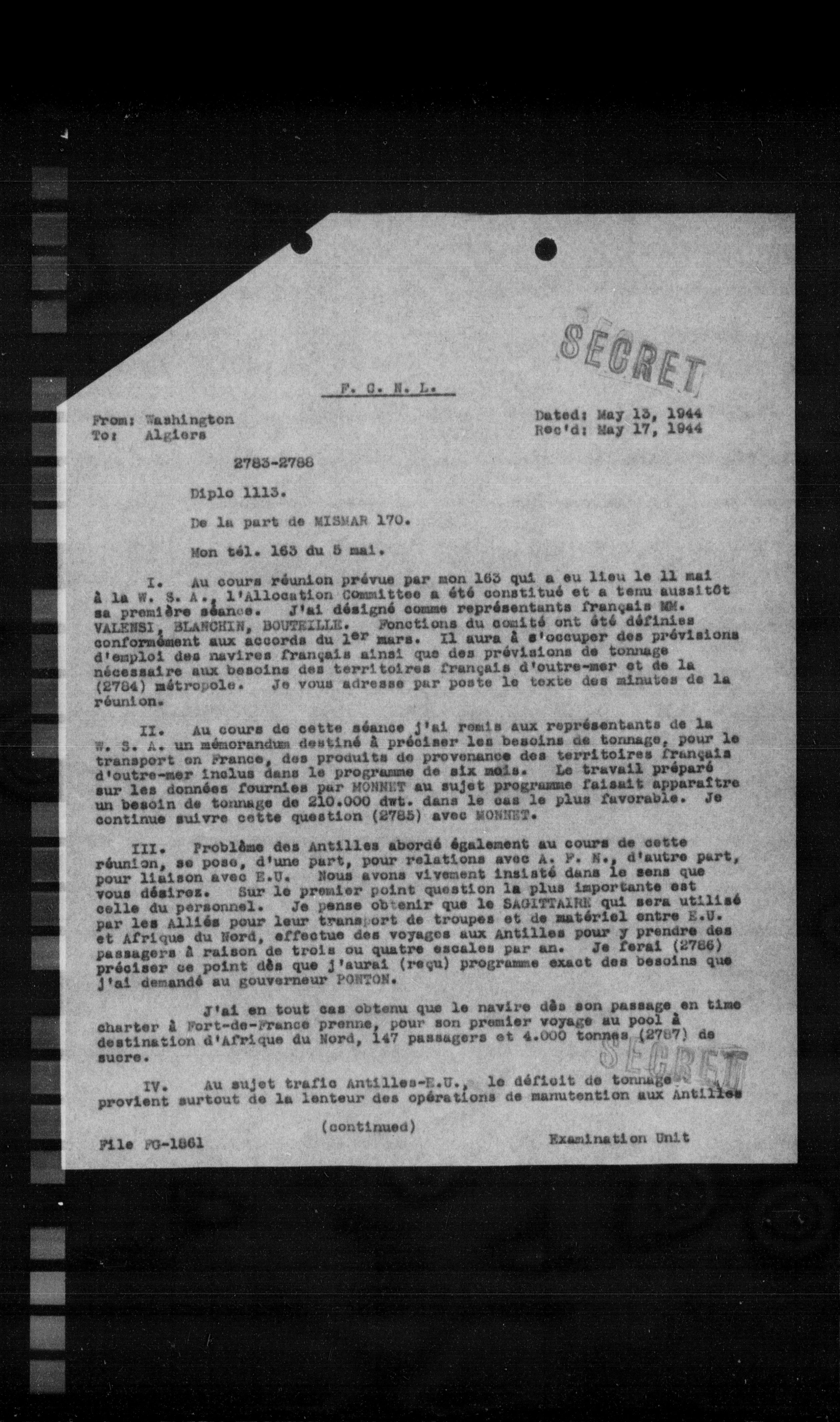 I. Au cours réunion prévue par mon 163 qui a eu lieu le 11 mai à la W. S. A., l'allocution Committee a été constitué et a tenu aussitôt sa première séance. J'ai désigné comme représentants français MR. VALENBI, BLANCHIN, BOUTEILLE. Fonctions du comité ont été définies conformément aux accords du 1er mars. Il aura à s'occuper des prévisions d'emploi des navires français ainsi que des prévisions de tonnage nécessaire aux besoins des territoires français d'outre-mer et de la (2784) métropole. Je vous adresse par poste le texte des minutes de la réunion.