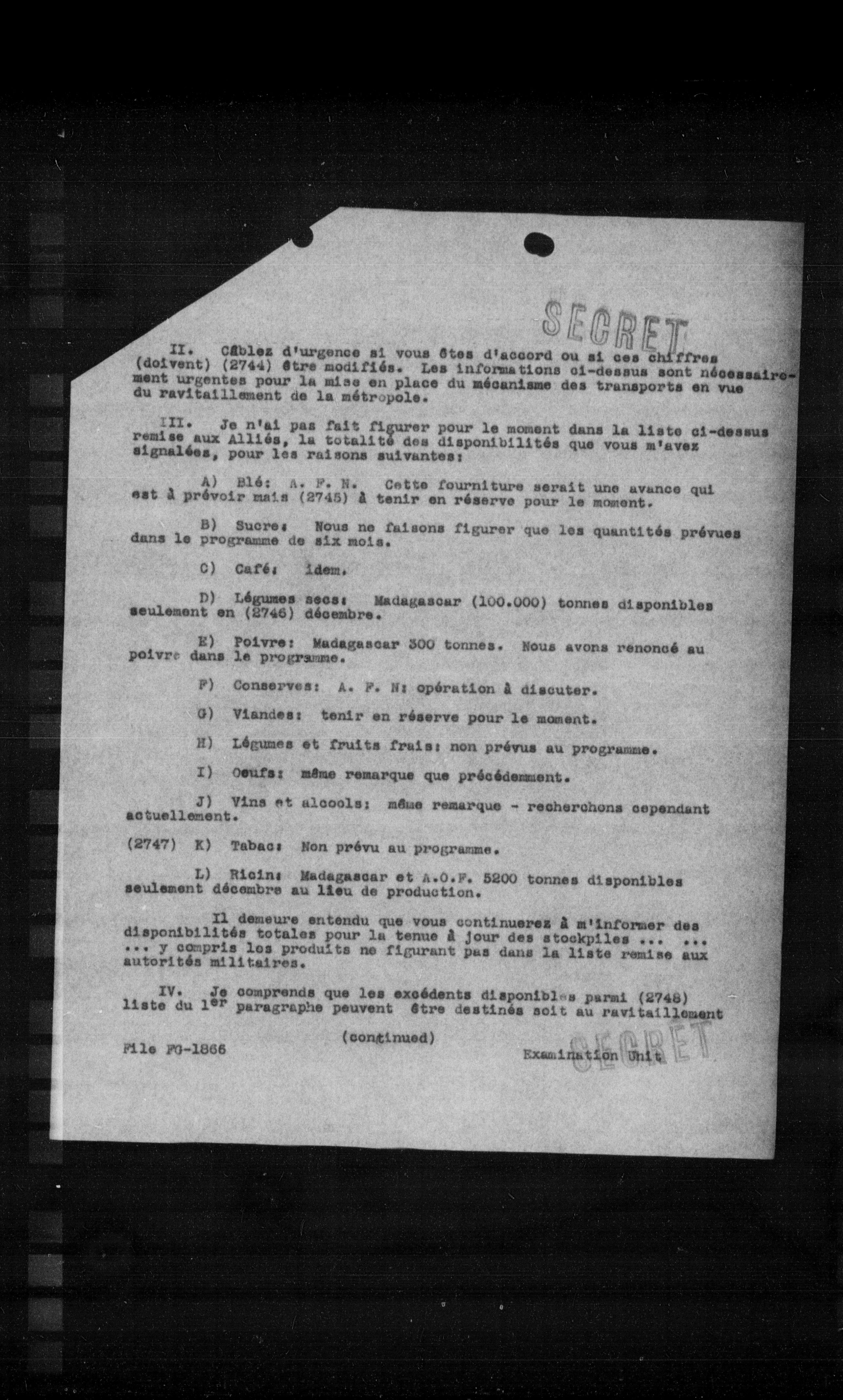 - II. Câbles d'urgence si vous êtes d'accord ou si ces chiffres (doivent) (2744) etre modifíés. Les informations ci-dessus sont nécessalro ment urgentes pour la mise en place du mécanisme des transports en vue du ravitallement de la métropole.