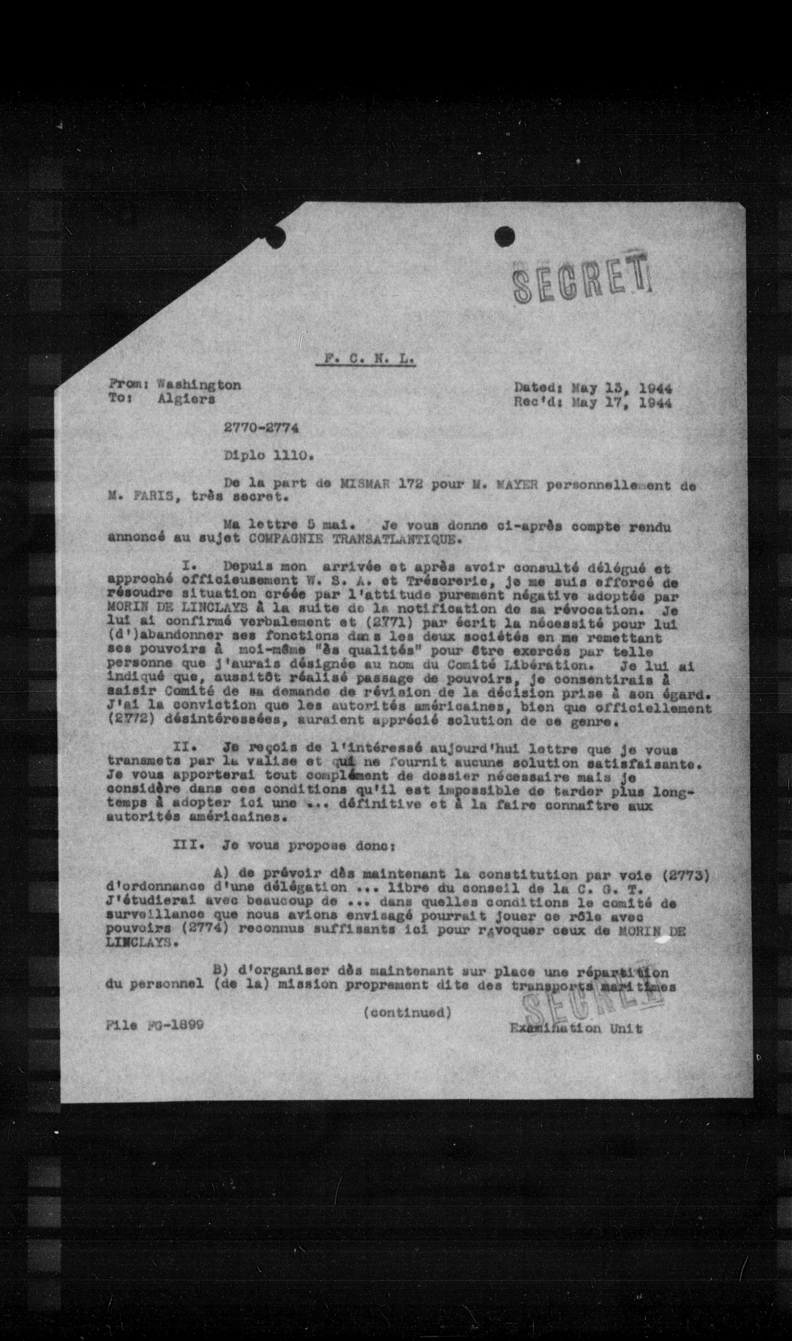 I. Depuis mon arrivée et après avoir consulté délégué et approché officieusement W. S. A. et Trésorerie, je me suis efforcé de résoudre situation créée par l'attitude purement négative adoptée par MORIN DE LINCLATS à la suite de la notification de sa révocation. Je lui ai confirmé verbalement et (2771) par écrit la nécessité pour lui (d')abandonner ses fonctions dans les deux sociétés en me remettant ses pouvoirs à moi-méme "les qualités" pour être exercés par telle personne que j'aurais désignée au nom du Comité Libération. Je lui ai indiqué que, aussitôt réalisé passage de pouvoirs, je consentirais à saisir Comité de sa demande de révision de la décision prise à son égard. J'ai la conviction que les autorités américaines, bien que officiellement (2772) désintéressées, auraient apprécié solution de ce genre.