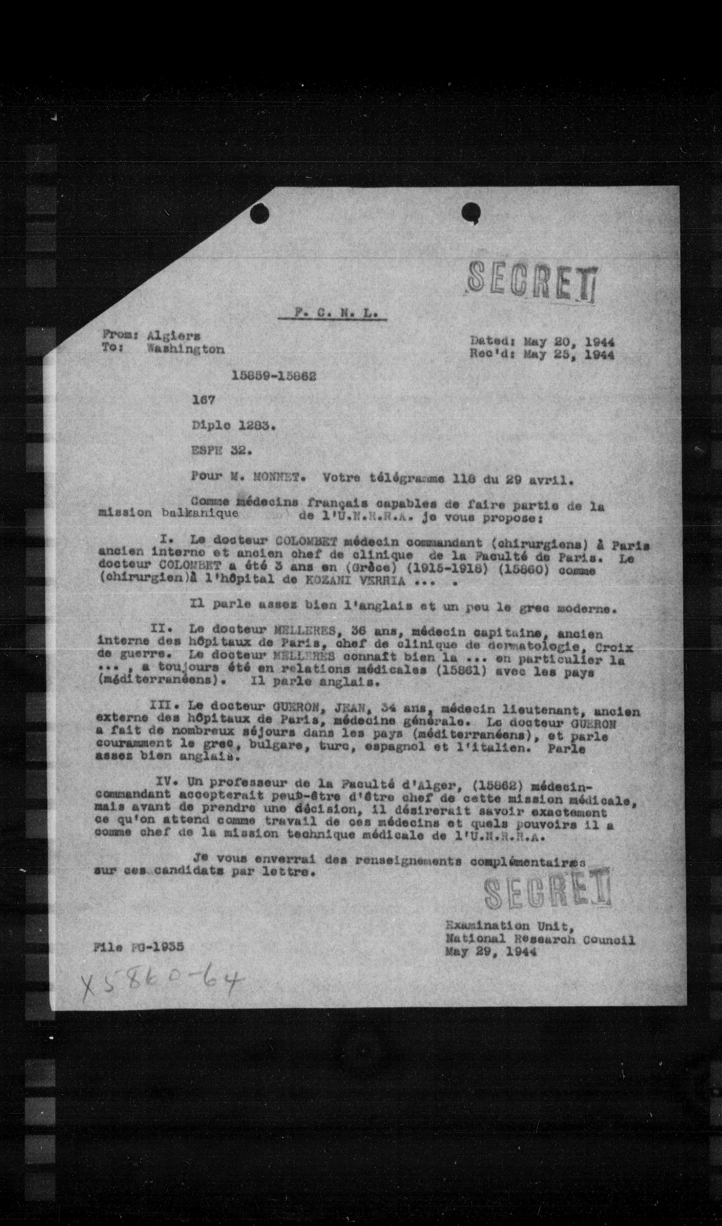 II. Le docteur MELLERES, 36 ans, médecin capitaine, ancien interne des hôpitaux de Paris, chef de clinique de dermatologie, Croix de guerre. Le docteur MELLERES connaît bien la ... en particulier la ..., a toujours été en relations médicales (15861) avec les pays (méditerranéens). Il parle anglais.
