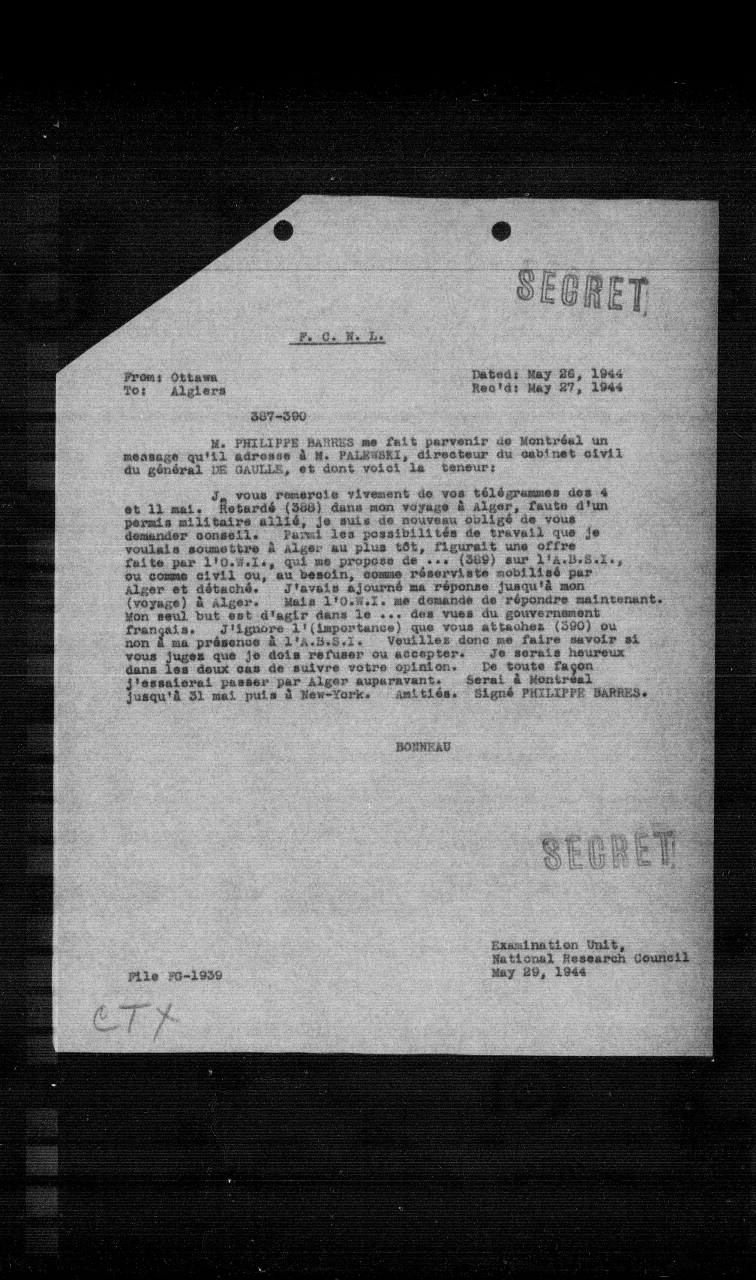 $J_{n}$ vous remercie vivement de vos télégrammes des 4 et 11 mai. Retardé (388) dans mon voyage à Alger, faute d'un permis militaire allié, je suis de nouveau obligé de vous demander conseil. Parmi les possibilités de travail que je voulais soumettre à Alger au plus tôt, figurait une offre faite par 1'0.8.1., qui me propose de ... (389) sur 1'A.S.S.I., ou comme civil ou, au besoin, comme réserviste mobilisé par Alger et détaché. J'avais ajourné ma réponse jusqu'à mon (voyage) à Alger. Mais 1'0.8.1. me demande de répondre maintenant. Mon seul but est d'agir dans le ... des vues du gouvernement français. J'ignore l'(importance) que vous attachez (390) ou non à ma présence à 1'A.S.S.I. Veuillez donc me faire savoir si vous jugez que je dois refuser ou accepter. Je serais heureux dans les deux cas de suivre votre opinion. De toute façon j'essaierai passer par Alger auparavant. Serai à Montréal jusqu'à 31 mai puis à New-York. Amitiés. Signé PHILIPPE BARRES.