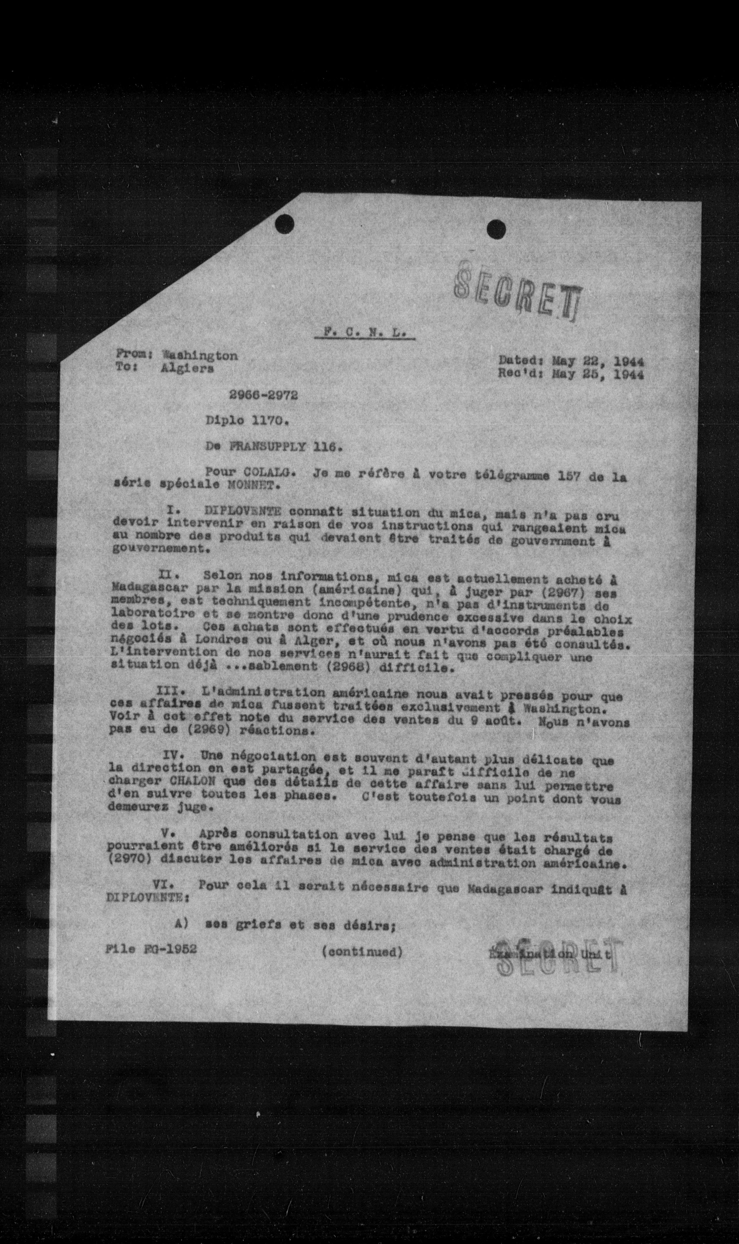 II. Selon nos informations, mica est actuellement acheté à Madagascar par la mission (américaine) qui, à juger par (2967) ses membres, est techniquement incompétente, n'a pas d'instruments de laboratoire et se montre donc d'une prudence excessive dans le choix des lots. Ces achats sont effectués en vertu d'accords préalables négociés à Londres ou à Alger, et où nous n'avons pas été consultés. L'intervention de nos services n'aurait fait que compliquer une situation déjà ...sablement (2968) difficile.
