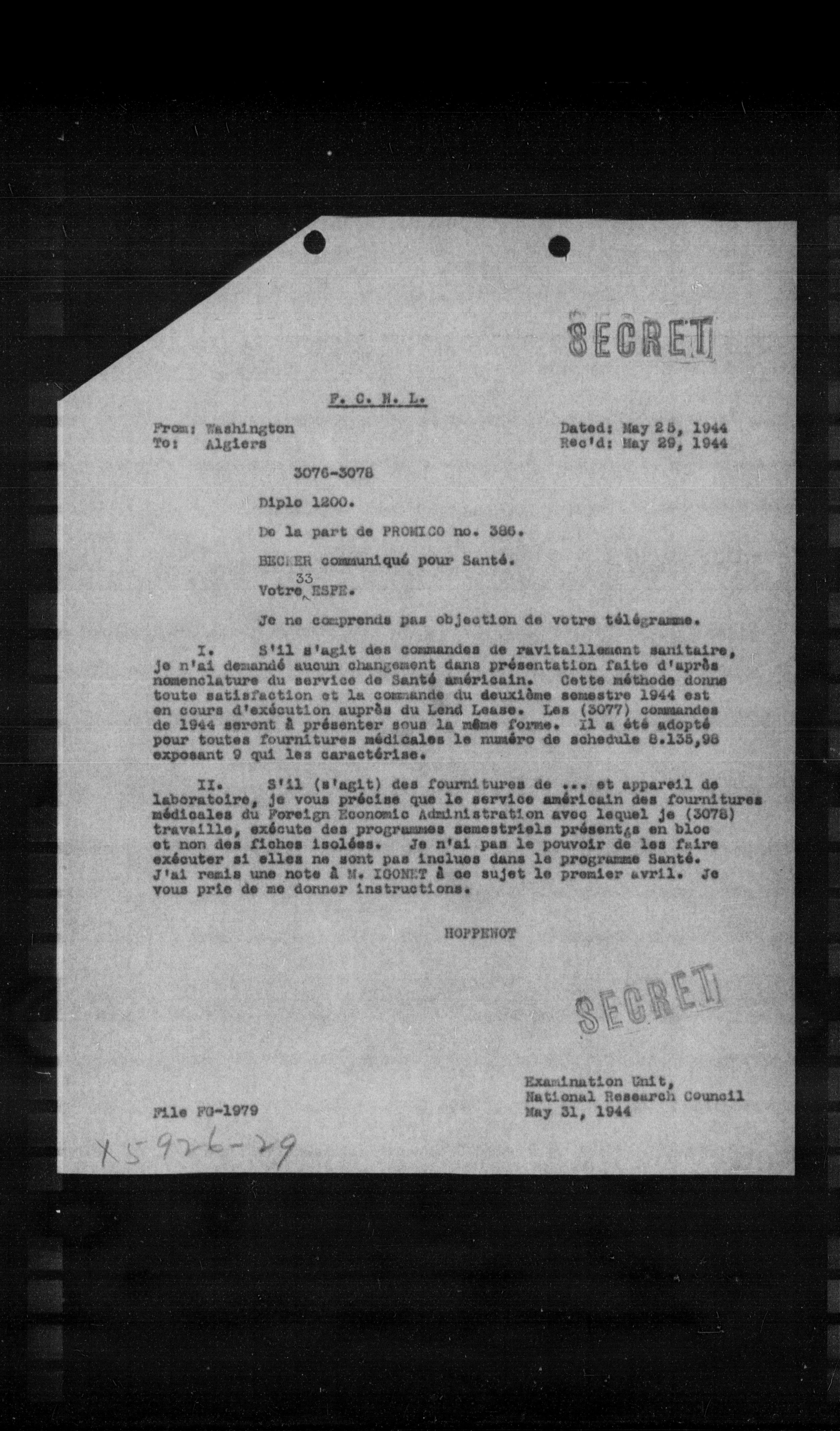 II. S'il (s'agit) des fournitures de ... et appareil de laboratoire, je vous précise que le service américain des fournitures médicales du Foreign Economic Administration avec lequel je (3078) travaille, exécute des programmes semestriels présentjs en bloc et non des fiches isolées. Je n'ai pas le pouvoir de les faire exécuter si elles ne sont pas inclues dans le programme Santé. J'ai remis une note à M. IOONET à ce sujet le premier avril. Je vous prie de me donner instructions.