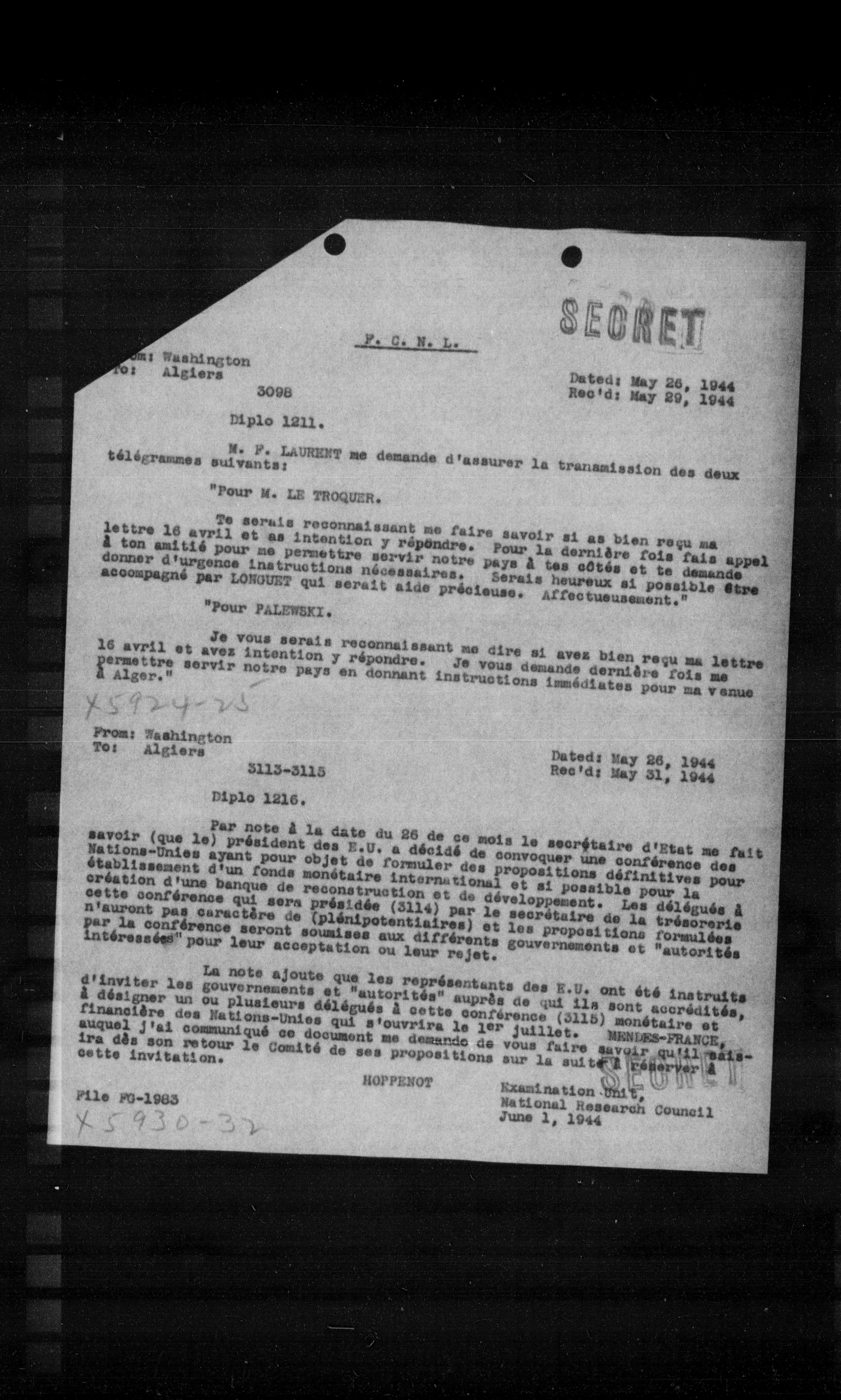 Par note à la date du 26 de ce mois le secrétaire d'Etat me fait savoir (que le) président des E.U. a décidé de convoquer une conférence des Nations-Unies ayant pour objet de formuler des propositions définitives pour établissement d'un fonds monétaire international et si possible pour la création d'une banque de reconstruction et de développement. Les délégués à cette conférence qui sera présidée (3114) par le secrétaire de la trésorerie n'auront pas caractère de (plénipotentiaires) et les propositions formulées par la conférence seront soumises aux différents gouvernements et "autorités intéressées" pour leur acceptation ou leur rejet.