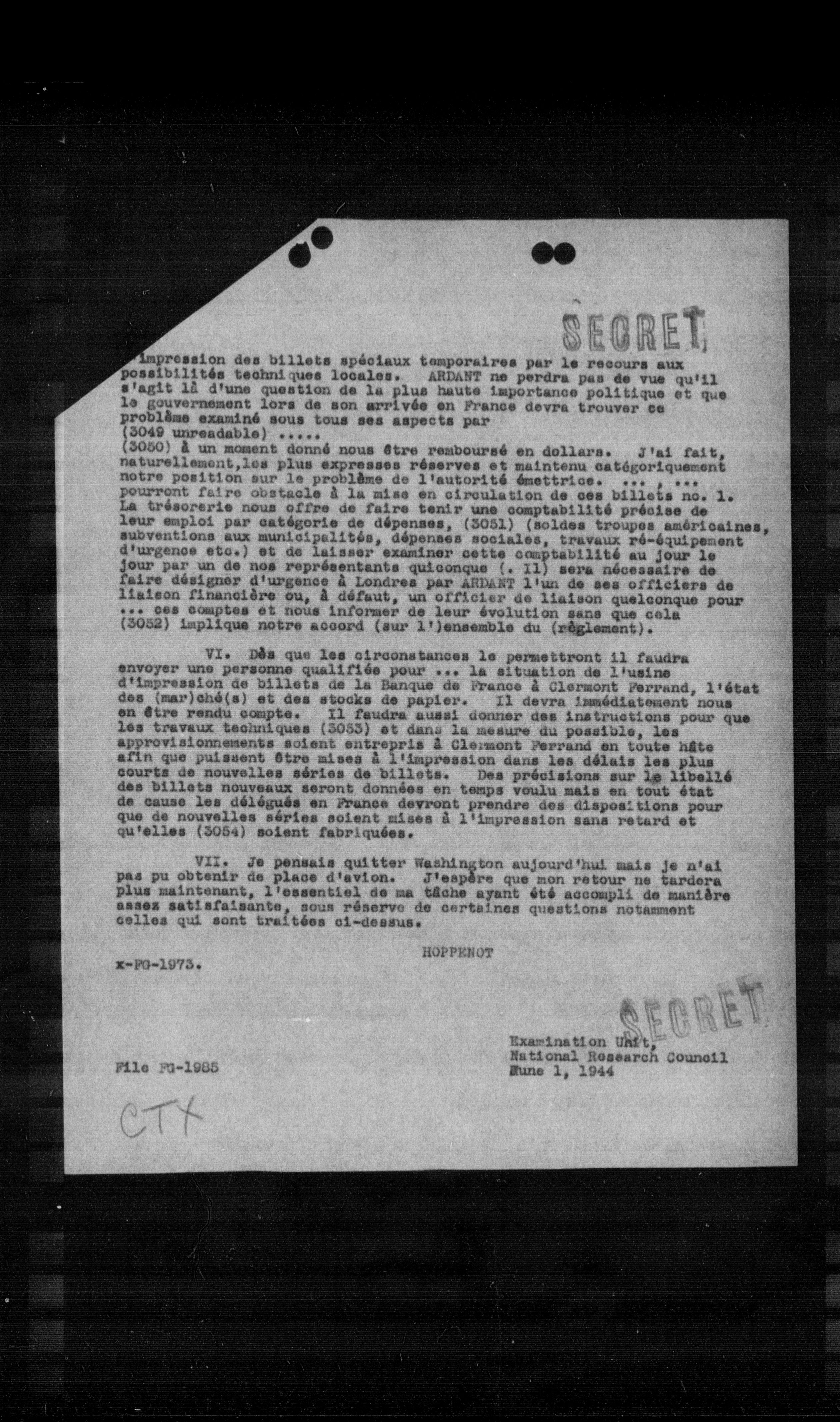 ## VI. Dès que les circonstances le permettront il faudra envoyer une personne qualifiée pour la situation de l'usine d'impression de billets de la Banque de France à Clermont Ferrand, l'état des (mar)shé(s) et des stocks de papier. Il devra immédiatement nous en être rendu compte. Il faudra aussi donner des instructions pour que les travaux techniques (3053) et dans la mesure du possible, les approvisionnements soient entrepris à Clermont Ferrand en toute hâte afin que puissent être mises à l'impression dans les délais les plus courts de nouvelles séries de billets. Des précisions sur le libellé des billets nouveaux seront données en temps voulu mais en tout état de cause les délégués en France devront prendre des dispositions pour que de nouvelles séries soient mises à l'impression sans retard et qu'elles (3054) soient fabriquées.
