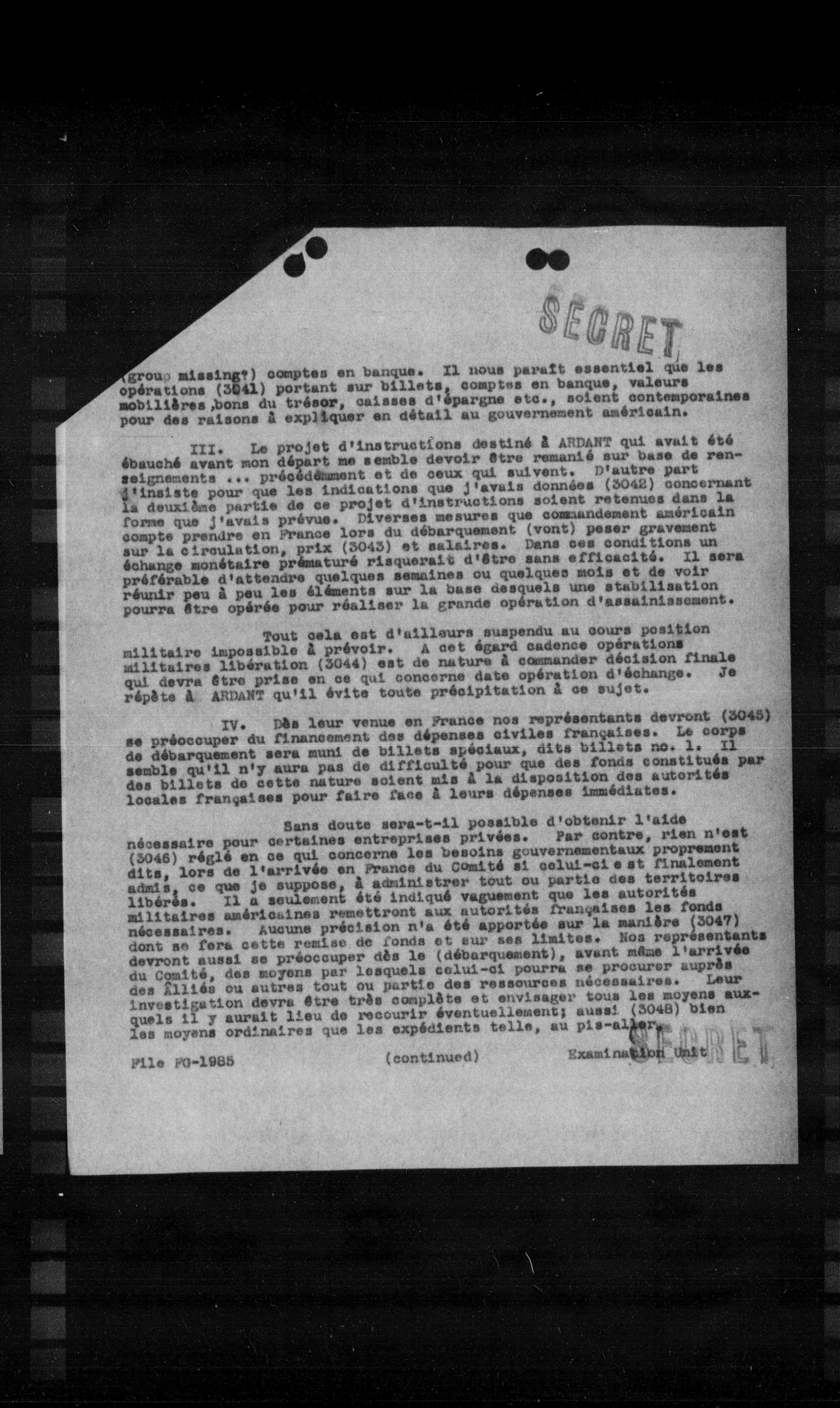 ## III. Le projet d'instructions destiné à ARDART qui avait été ébauché avant mon départ me semble devoir être remanié sur base de renseignements précédemment et de ceux qui suivent. D'autre part j'insiste pour que les indications que j'avais données (3042) concernant la deuxième partie de ce projet d'instructions soient retenues dans la forme que j'avais prévue. Diverses mesures que commandement américain compte prendre en France lors du débarquement (vont) peser gravement sur la circulation, prix (3043) et salaires. Dans ces conditions un échange monétaire prématuré risquerait d'être sans efficacité. Il sera préférable d'attendre quelques semaines ou quelques mois et de voir réunir peu à peu les éléments sur la base desquels une stabilisation pourra être opérée pour réaliser la grande opération d'assainissement.