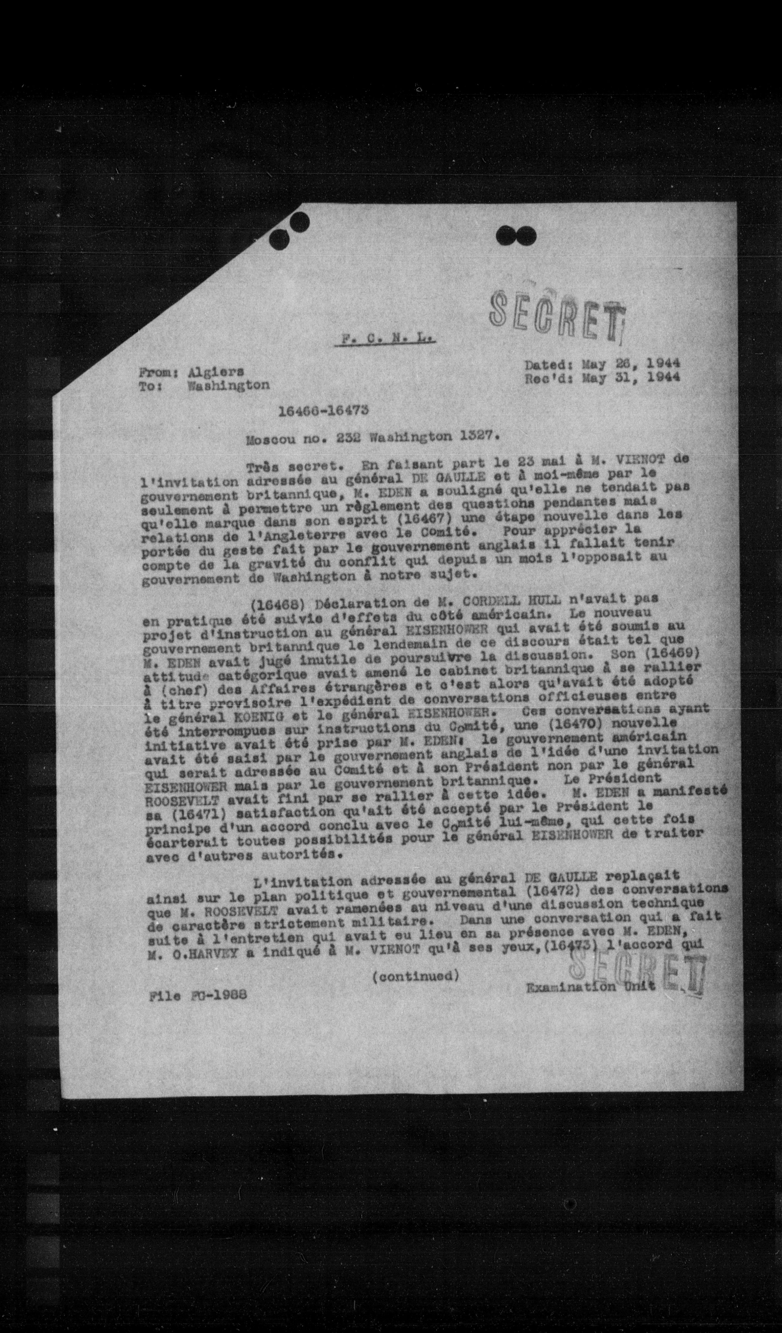 (16468) Déclaration de M. CORDELL HULL n'avait pas en pratique été suivie d'effets du côté américain. Le nouveau projet d'instruction au général RISERHOWER qui avait été soumis au gouvernement britannique le lendemain de ce discours était tel que M. EDEN avait jugé inutile de poursuivre la discussion. Son (16469) attitude catégorique avait amené le cabinet britannique à se rallier à (chef) des Affaires étrangères et c'est alors qu'avait été adopté à titre provisoire l'expédient de conversations officieuses entre le général ROENIG et le général RISERHOWER. Ces conversations ayant été interrompues sur instructions du Comité, une (16470) nouvelle initiative avait été prise par M. EDEN. Le gouvernement américain avait été saisi par le gouvernement anglais de l'idée d'une invitation qui serait adressée au Comité et à son Président non par le général RISERHOWER mais par le gouvernement britannique. Le Président ROOSEVELT avait fini par se rallier à cette idée. M. EDEN a manifesté sa (16471) satisfaction qu'ait été accepté par le Président le principe d'un accord conclu avec le Comité lui-même, qui cette fois écarterait toutes possibilités pour le général RISERHOWER de traiter avec d'autres autorités.