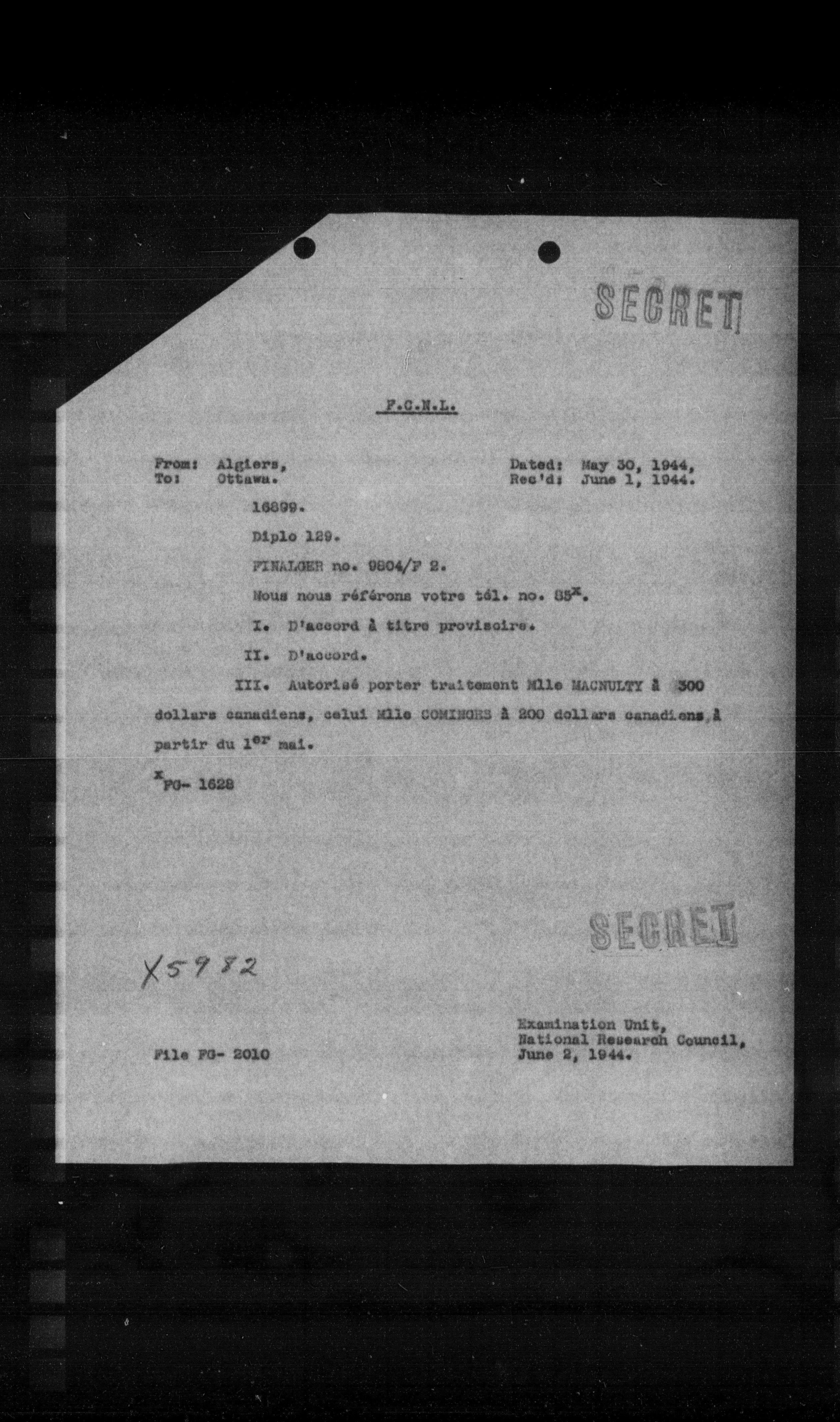 **From:** Algiers, **To:** Ottawa. **Date:** May 30, 1944, **Rec'd:** June 1, 1944.