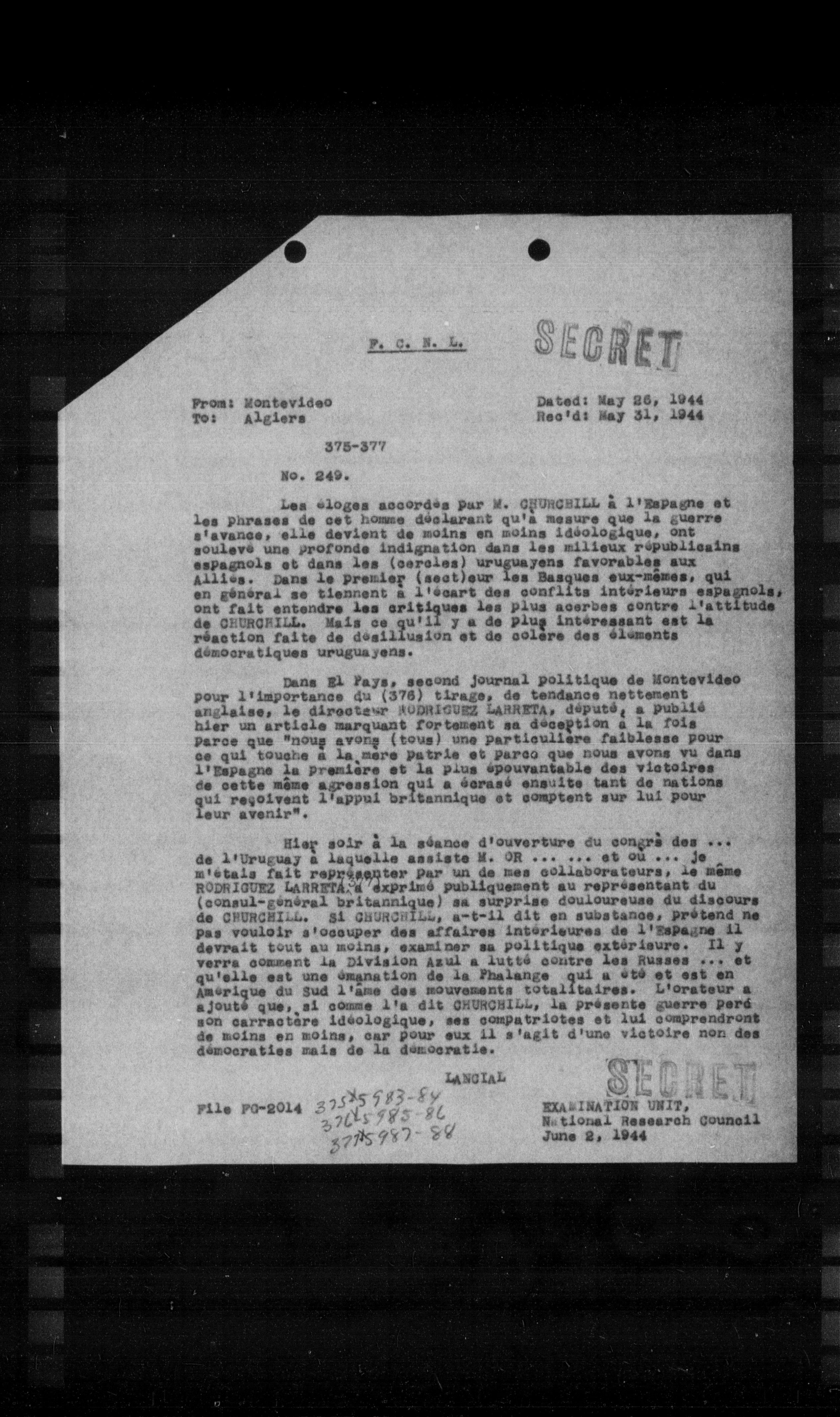 Hier soir à la séance d'ouverture du congrès des ... de l'Uruguay à laquelle assiste M. GR ... et on ... je m'étais fait représenter par un de mes collaborateurs, le même RODRIGUEZ LARRETA, à exprimé publiquement au représentant du (consui-général britannique) sa surprise douloureuse du discours de GRUNCHILL. Si GRUNCHILL, a-t-il dit en substance, prétend ne pas vouloir s'occuper des affaires intérieures de l'Espagne il devrait tout au moins, examiner sa politique extérieure. Il y verra comment la Division Azul a lutté contre les Russes ... et qu'elle est une organisation de la Phalange qui a été et est en Amérique du Sud l'âme des mouvements totalitaires. L'orateur a ajouté que, si comme l'a dit GRUNCHILL, la présente guerre perd son caractère idéologique, ses compatriotes et lui comprendront de moins en moins, car pour eux il s'agit d'une victoire non des démocraties mais de la démocratie.