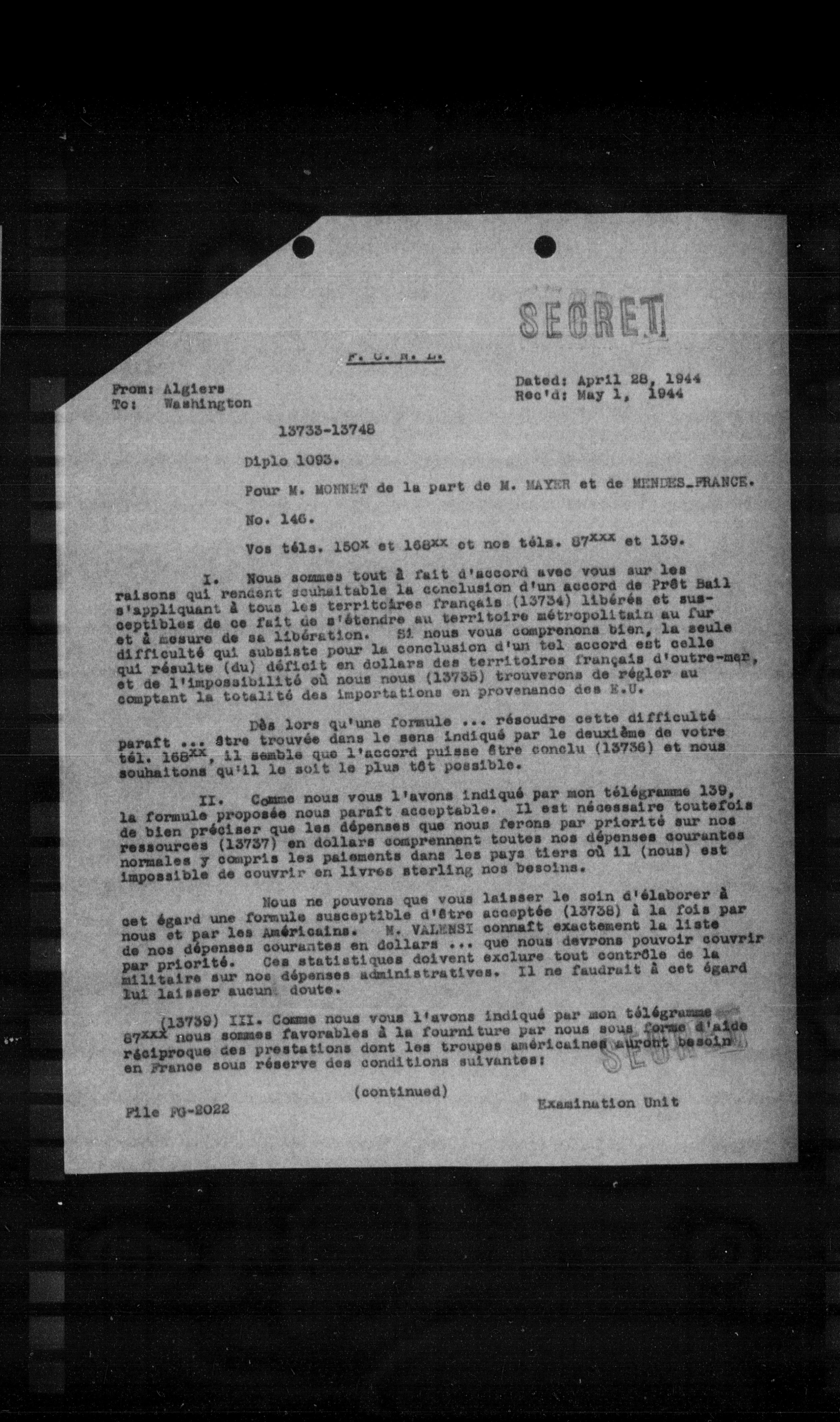 I. Nous sommes tout à fait d'accord avec vous sur les raisons qui rendent souhaitable la conclusion d'un accord de Prêt Bail s'appliquant à tous les territoires français (13734) libérés et susceptibles de ce fait de s'étendre au territoire métropolitain au fur et à mesure de sa libération. Si nous vous comprenons bien, la seule difficulté qui subsiste pour la conclusion d'un tel accord est celle qui résulte (du) déficit en dollars des territoires français d'outre-mer, et de l'impossibilité où nous nous (13735) trouverons de régler au comptant la totalité des importations en provenance des S.U.