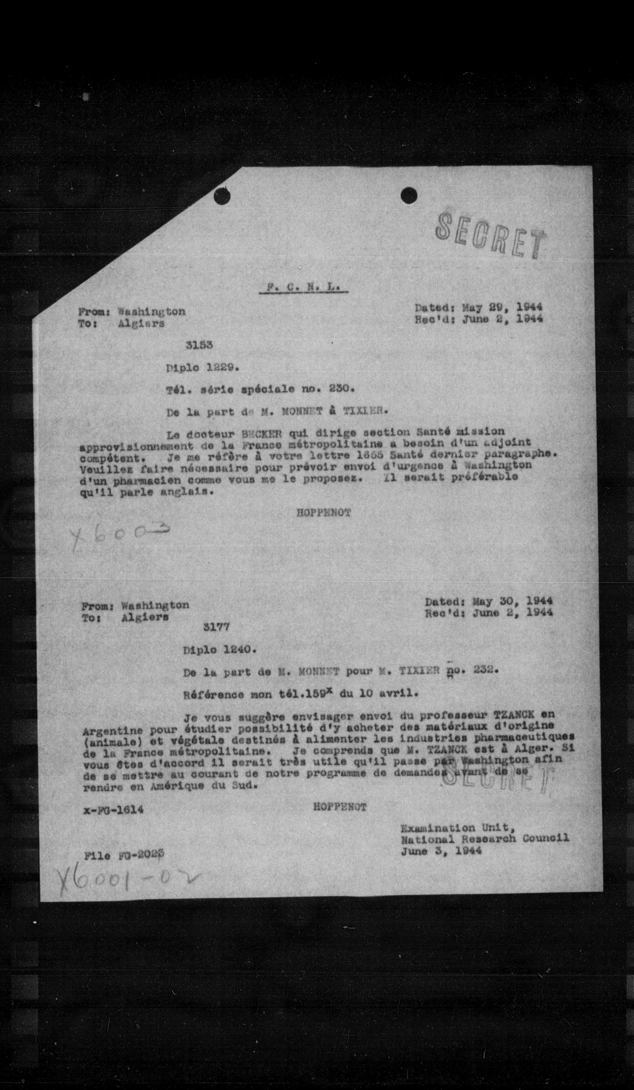 Le docteur SECKER qui dirige section Santé mission approvisionnement de la France métropolitaine a besoin d'un adjoint compétent. Je me réfère à votre lettre 1855 Santé dernier paragraphe. Veuillez faire nécessaire pour prévoir envoi d'urgence à Washington d'un pharmacien comme vous me le proposez. Il serait préférable qu'il parle anglais.