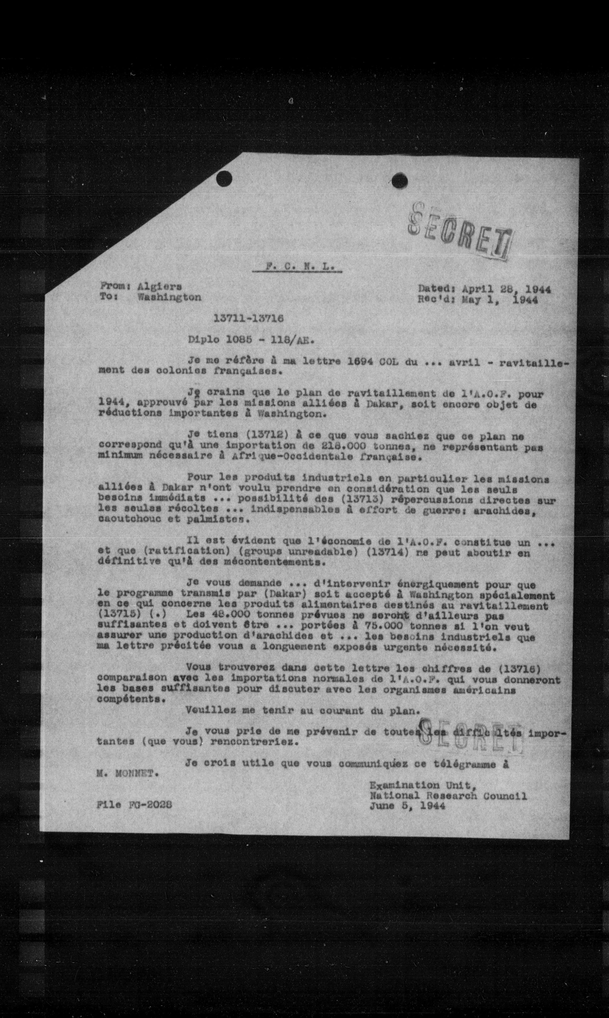 Je crains que le plan de ravitaillement de l'A.O.F. pour 1944, approuvé par les missions alliées à Dakar, soit encore objet de réductions importantes à Washington.