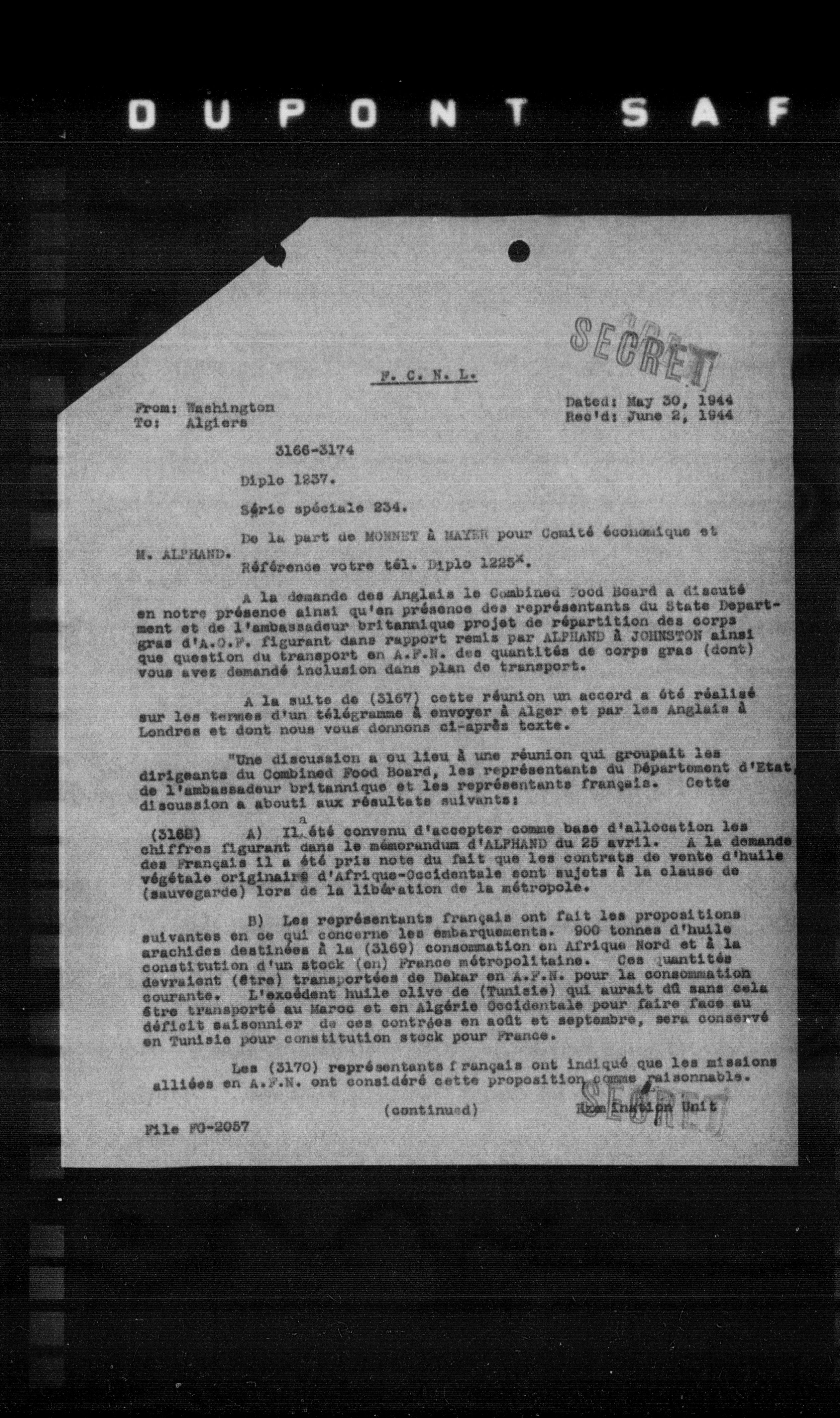 "Une discussion a ou lieu à une réunion qui groupait les dirigeants du Combined Food Board, les représentants du Département d'Etat, de l'ambassadeur britannique et les représentants français. Cette discussion a abouti aux résultats suivants: