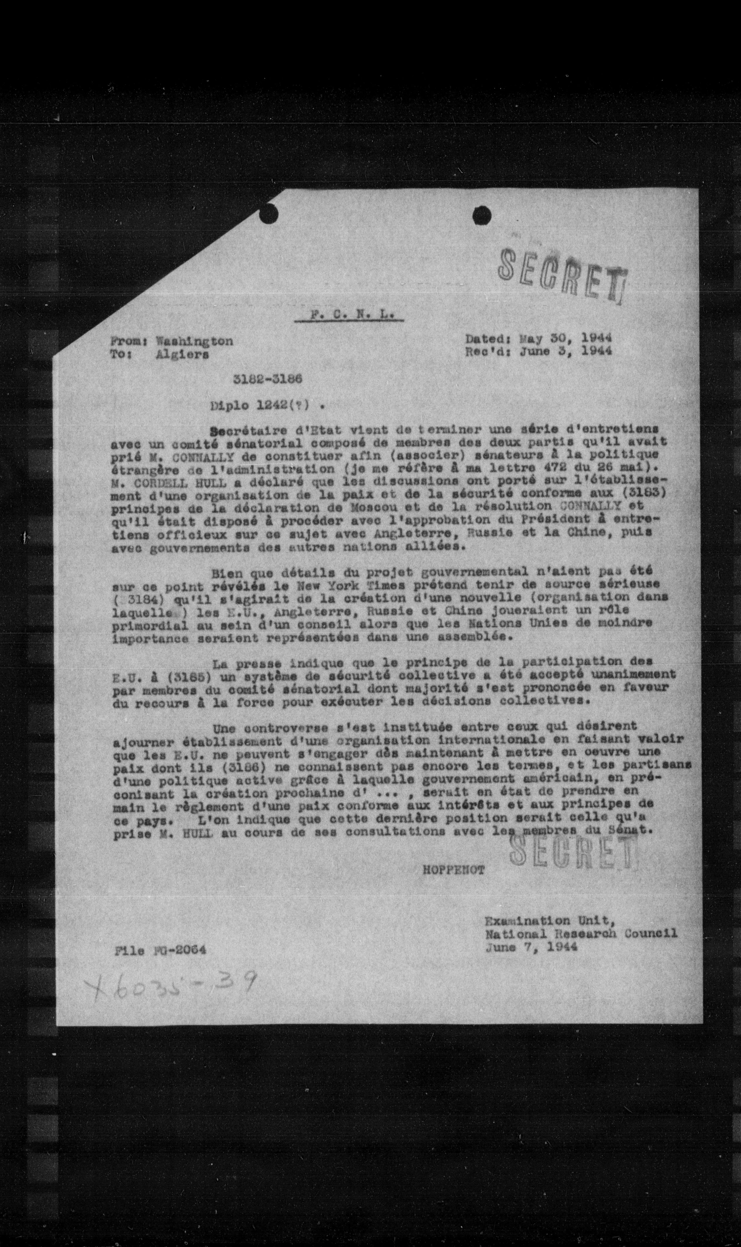 Secrétaire d'État vient de terminer une série d'entretiens avec un comité sénatorial composé de membres des deux partis qu'il avait pris M. CONNALLY de constituer afin (associer) sénateurs à la politique étrangère de l'administration (je me réfère à ma lettre 472 du 26 mai). M. CONNELL HULL a déclaré que les discussions ont porté sur l'établissement d'une organisation de la paix et de la sécurité conforme aux (3183) principes de la déclaration de Moscou et de la résolution CONNALLY et qu'il était disposé à procéder avec l'approbation du Président à entretiens officieux sur ce sujet avec Angleterre, Russie et la Chine, puis avec gouvernements des autres nations alliées.