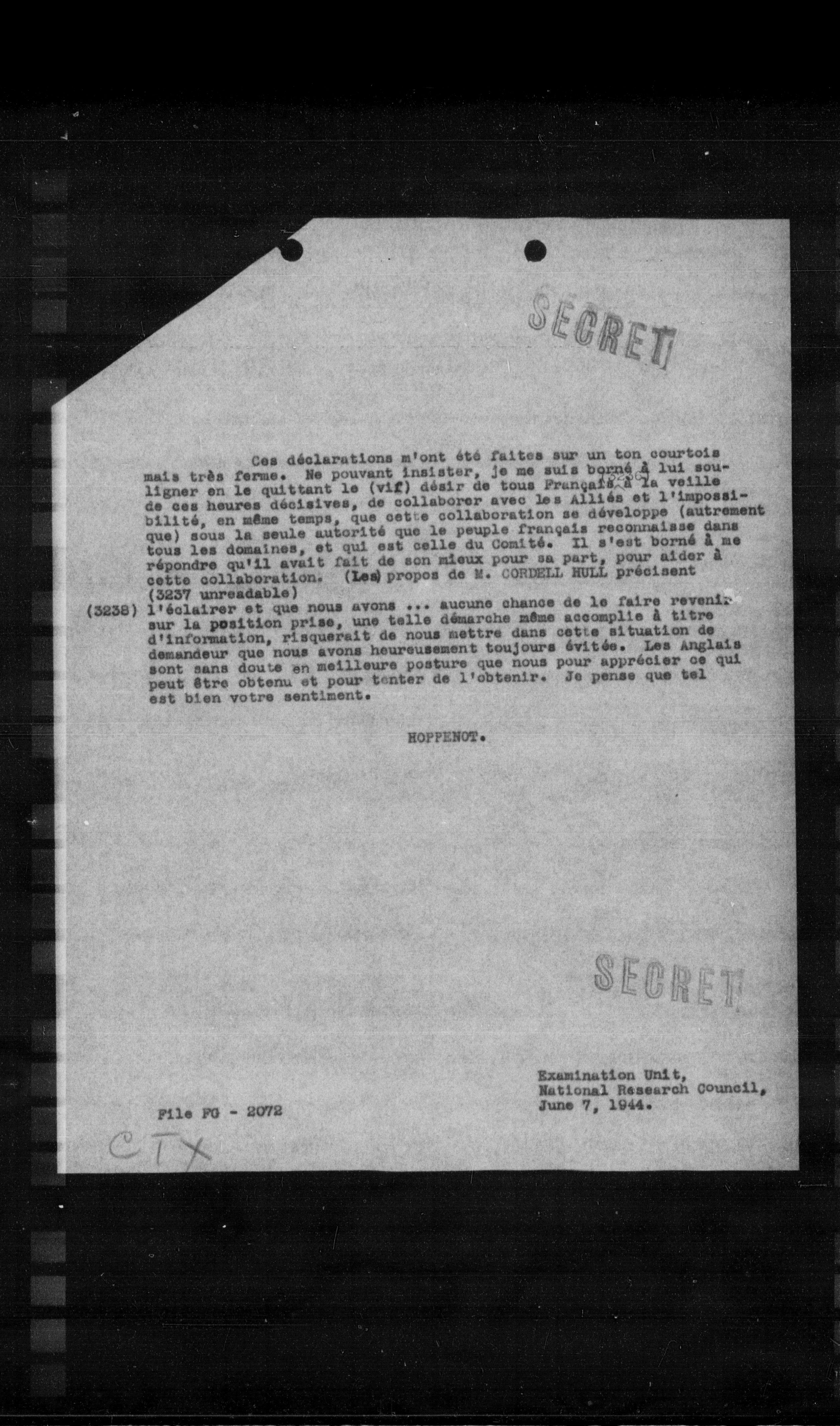 Ces déclarations m'ont été faites sur un ton courtois mais très ferme. Ne pouvant insister, je me suis bagné a lui soulligner en le quittant le (vif) désir de tous Frangafé. a la veille de ces heures décisives, de collaborer avec les Allies et l'impossibilité, en meme temps, que cette collaboration se développe (autrement que) sous la seule autorité que le peuple frangais reconnaisse dans tous les domaines, et qui est celle du Comite. Il s'est borné a me répondre qu'il avait fait de son mieux pour sa part, pour aider a cette collaboration. (Led propos de W. CONDELL HULL précisent (3237 unreadable)