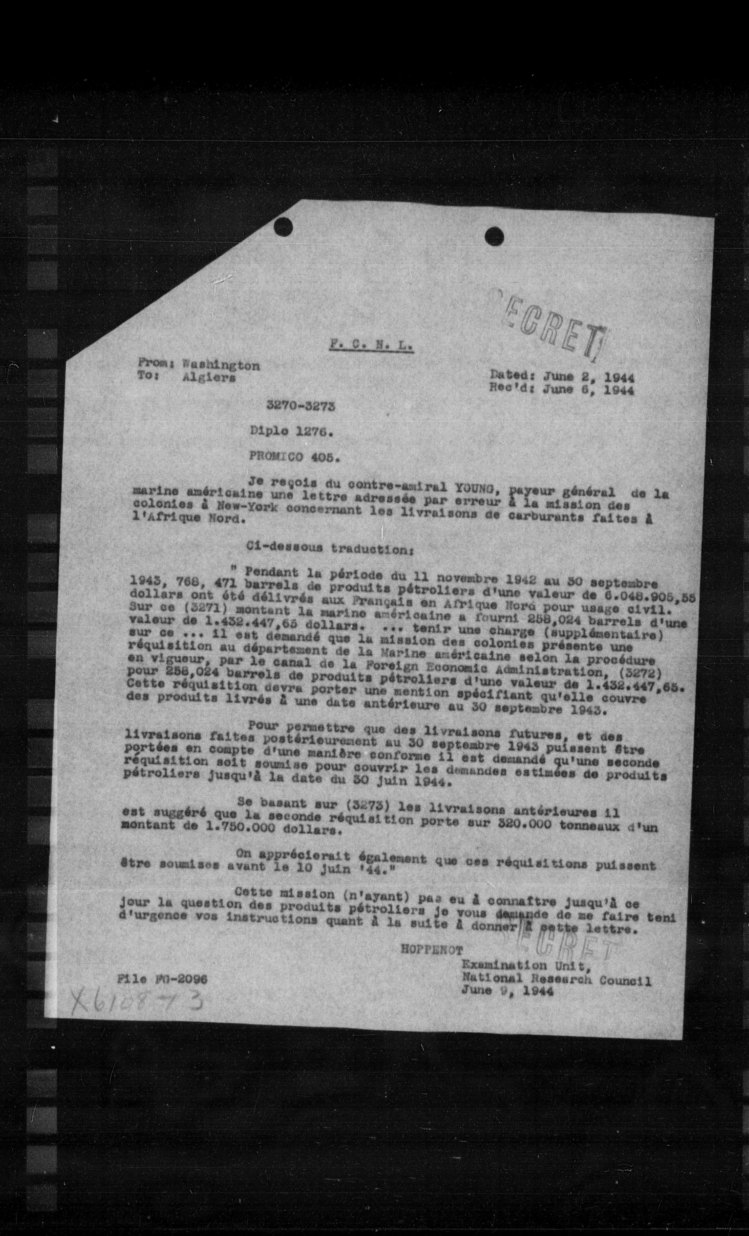 "Pendant la période du 11 novembre 1942 au 30 septembre 1943, 768,471 barrels de produits pétroliers d'une valeur de 6.048.900,50 dollars ont été délivrés aux Français en Afrique Nord pour usage civil. Sur ce (3271) montant la marine américaine a fourni 258,024 barrels d'une valeur de 1.432.447,65 dollars. ... tenir une charge (supplémentaire) sur ce ... il est demandé que la mission des colonies présente une réquisition au département de la Marine américaine selon la procédure en vigueur, par le canal de la Foreign Economic Administration, (3272) pour 258,024 barrels de produits pétroliers d'une valeur de 1.432.447,65. Cette réquisition devra porter une mention spécifiant qu'elle couvre des produits livrés à une date antérieure au 30 septembre 1943.